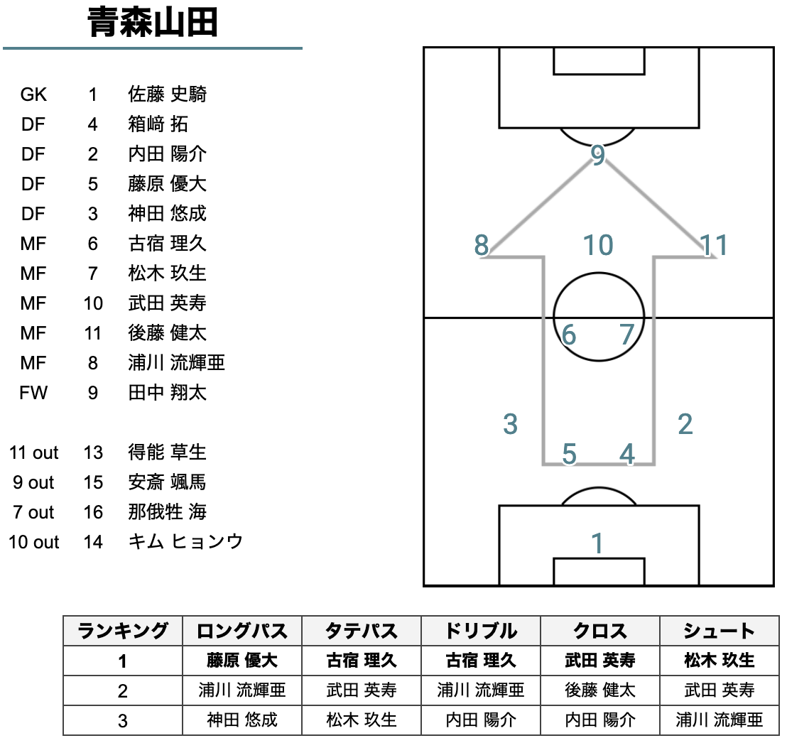 青森山田のロングパスは5番の藤原選手、タテパス、ドリブルは6番の古宿選手、クロスは10番の武田選手、シュートは7番の松木選手が多かったです。中央に位置する選手が積極的に前進するプレーを行っていました。特に古宿選手は攻撃のキーマンだったと言えそうです。