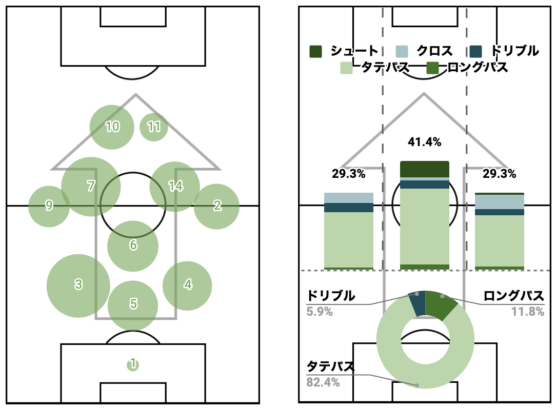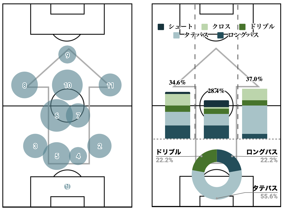 以上は、SPLYZATeamsを使って、前進するプレー(ロングパス、タテパス、ドリブル、クロス、シュート)と、プレーが起きた位置、プレイヤーにタグをつけ、その集計結果を使って作成されたレポートです。(セットプレーやクリアボールなど、味方に通す意図が汲み取れないプレーは集計されていません)