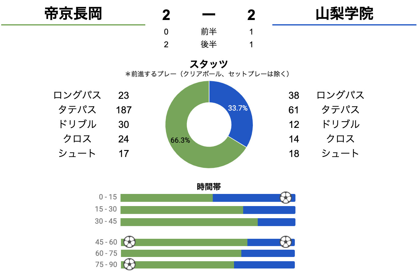 試合を通じて、帝京長岡がボールを多く扱っていましたが、山梨学院も積極的に攻撃を仕掛け、シュート数では上回っていました。