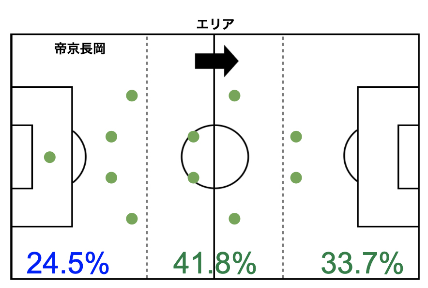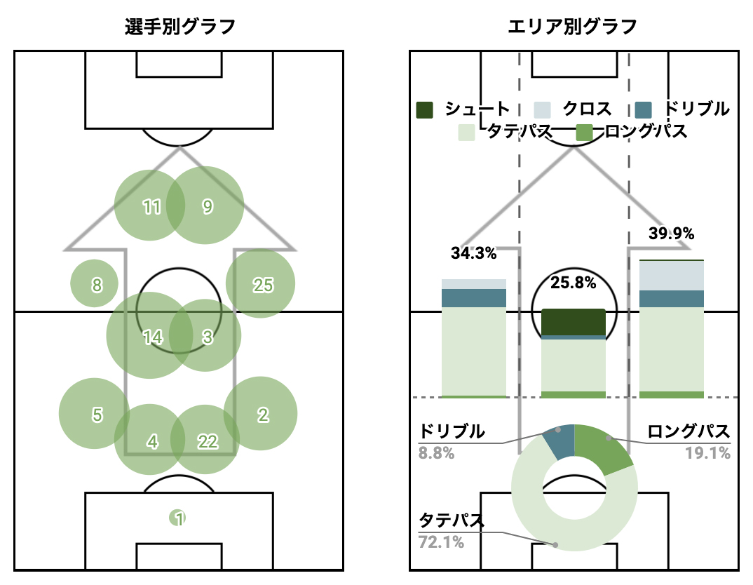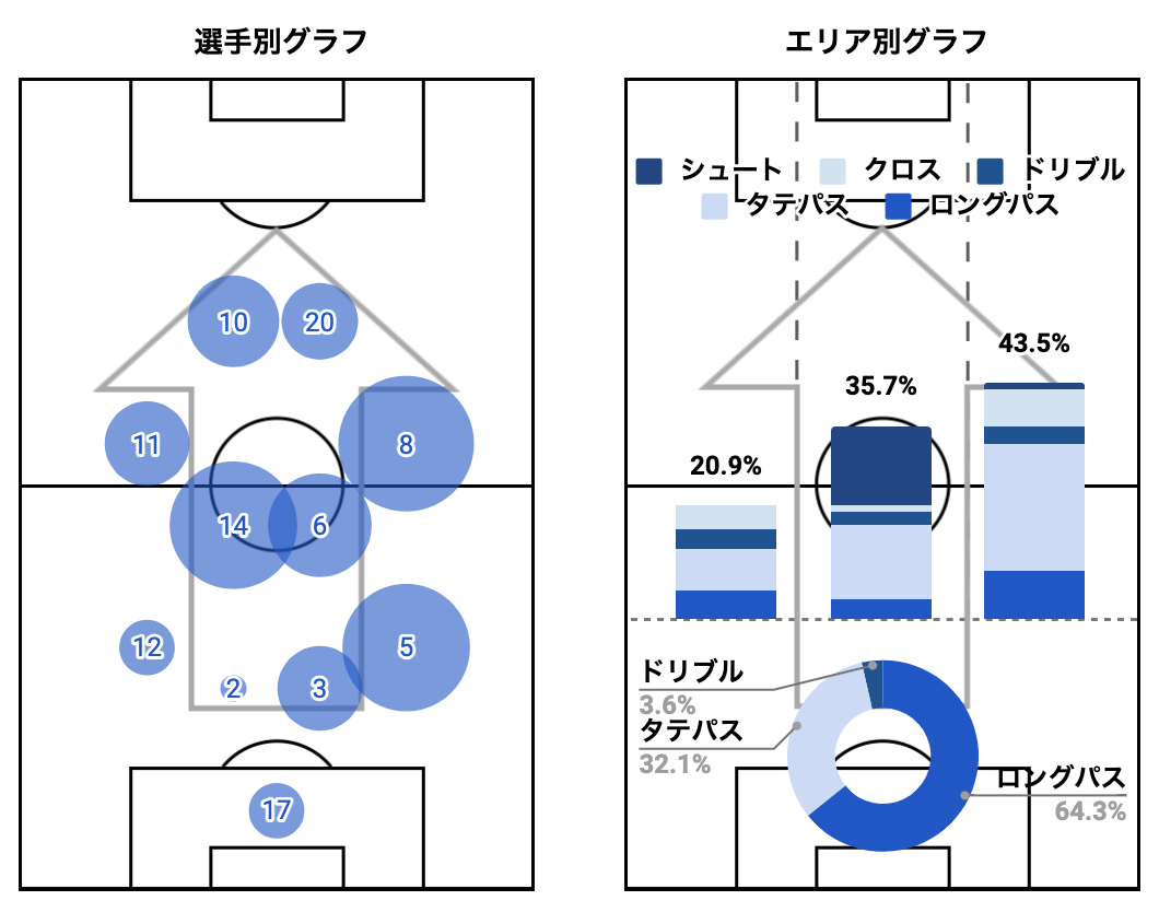エリア別グラフからは、自陣1/3ではロングパスで主体で、右サイドからの攻撃に偏っていました。右サイドに位置する8番の新井選手、5番の鈴木選手が積極的に攻撃に絡みゴールに迫っていました。