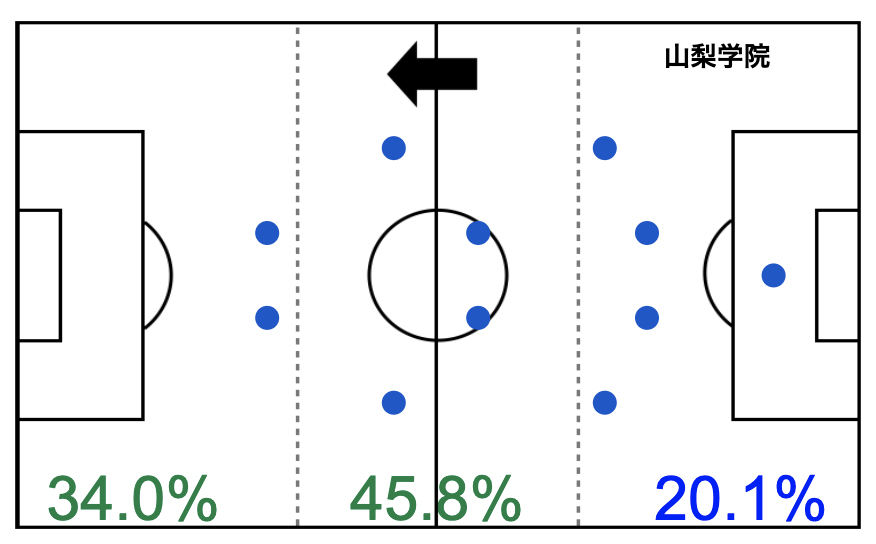 これは昌平戦と同様の傾向で、山梨学院は自陣ではロングパス、そして特に右サイドからボール運ぶ傾向があると言えそうです。