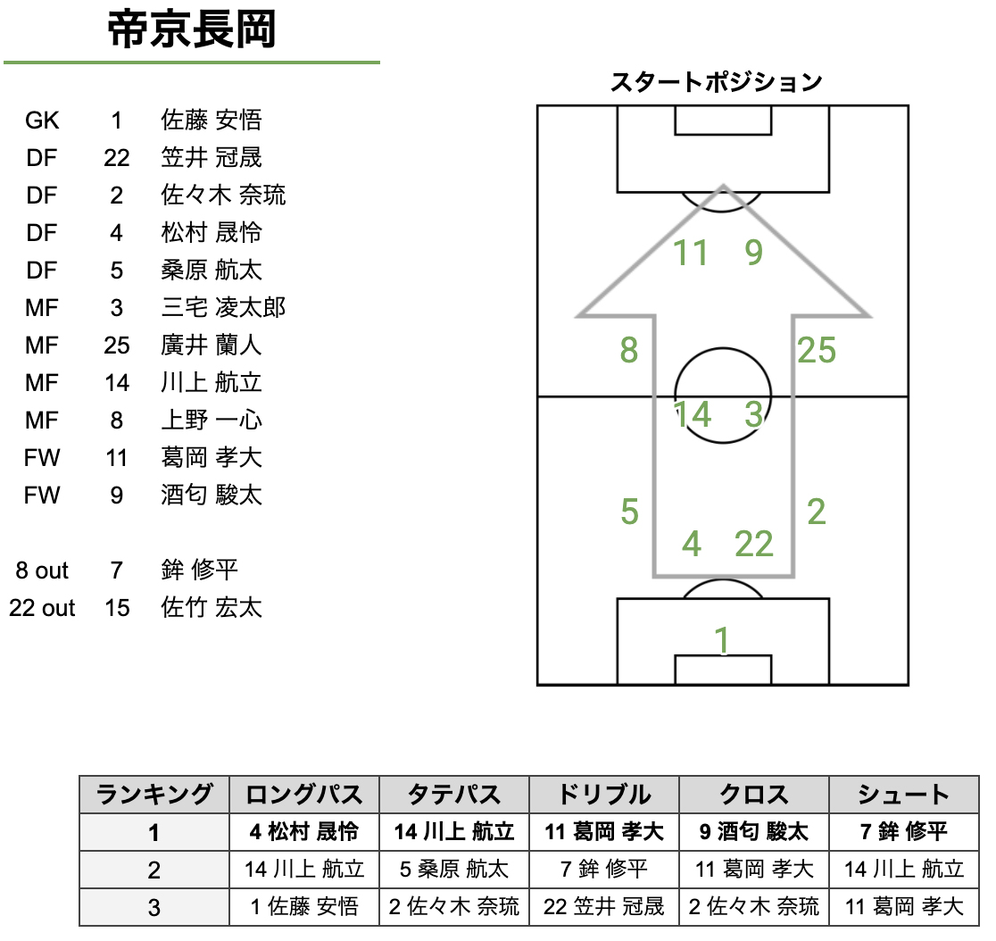 昌平戦と同じメンバーとフォーメーション。守備から入り、シンプルにボールを前に運び多くのシュートチャンスを作っていました。昌平戦のデータはこちら