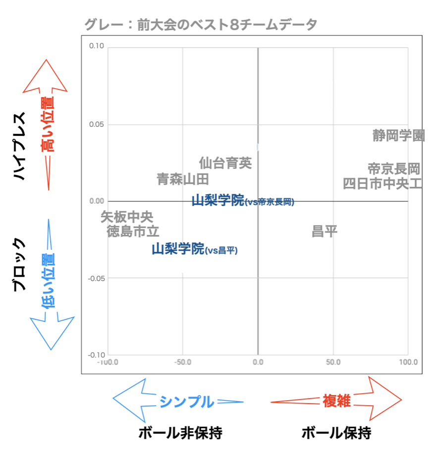 この試合のデータでは、ボール非保持側でハイプレスとブロックの間という位置付けとなり、昌平戦と比較するとハイプレスの傾向は強まりました。山梨学院は守備から入りうシンプルにゴールを狙う堅守速攻スタイルとして分類できますが、この試合ではより前に出て守備を行っていた様子がデータに現れています。4-4-2の守備から相手の攻撃を抑えつつ、カウンターでゴールを狙い18本のシュートをこの試合で放っていました。