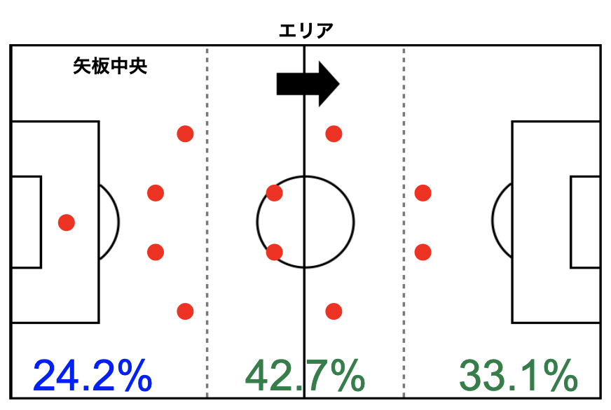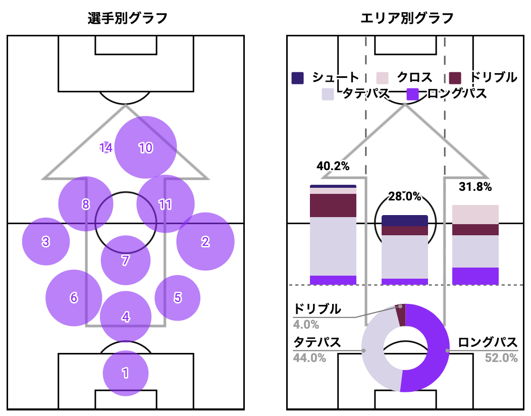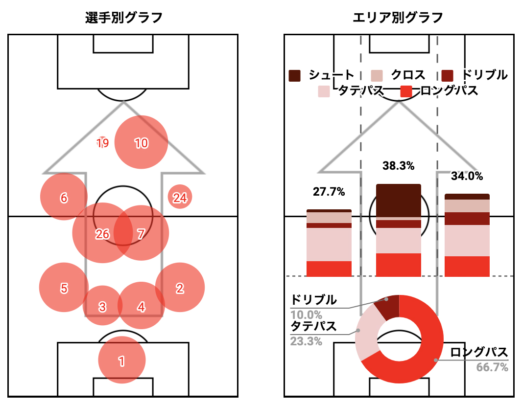 エリア別グラフからは、自陣では主にロングパスでボールを前に運び、右サイドから攻撃を仕掛けていた様子が汲み取れます。