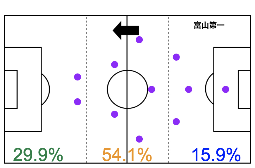 富山第一は多く前にボールを運んでいましたが、フィールド中盤での割合が多く、相手陣地深くでプレーできずゴールに迫りきれなかった印象です。