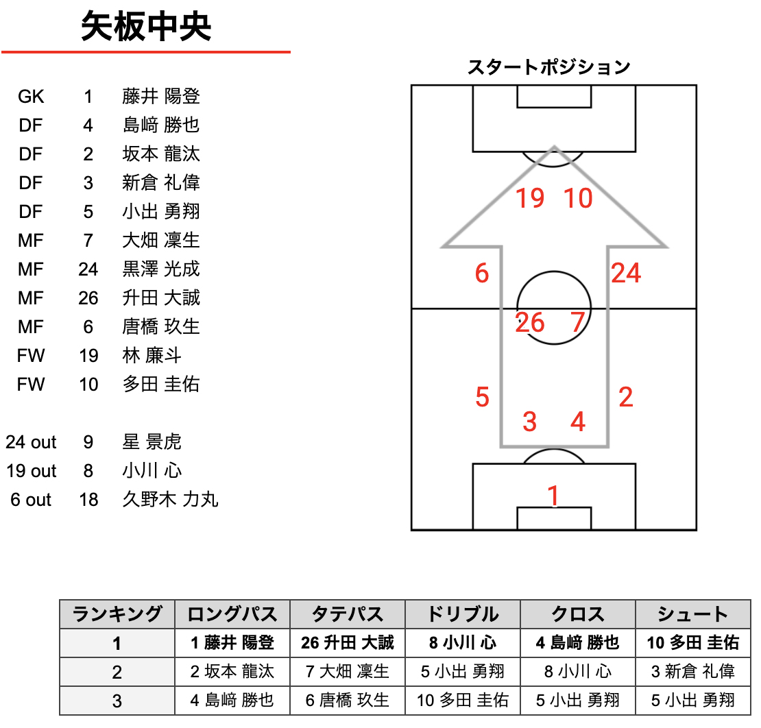 この試合データから、矢板中央はボール非保持でブロックというスタイルに分類されます。自陣ではロングボールを使ってシンプルにボールを前に運び、セカンドボールを拾って、裏を狙った選手に繋げるというシーンが多く見られました。
