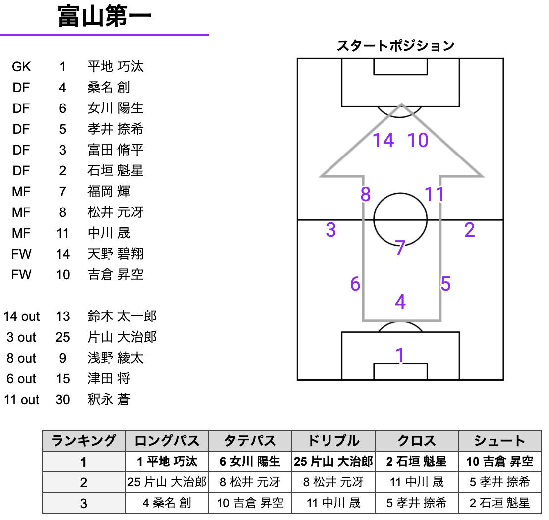 フォーメーションは4-4-2。富山第一戦ではしっかりとした守備からの速攻で多くのシュートチャンスを生み出していました。10番の多田選手が積極的に裏に抜け出して自身でシュート、チャンスメイクという活躍を見せていました。
