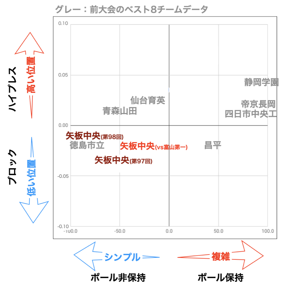 過去の2大会と同様、低い位置での守備からシンプルに効率良く攻撃を仕掛ける、矢板中央の「堅守速攻」というスタイルが継続されていることがデータからわかります。