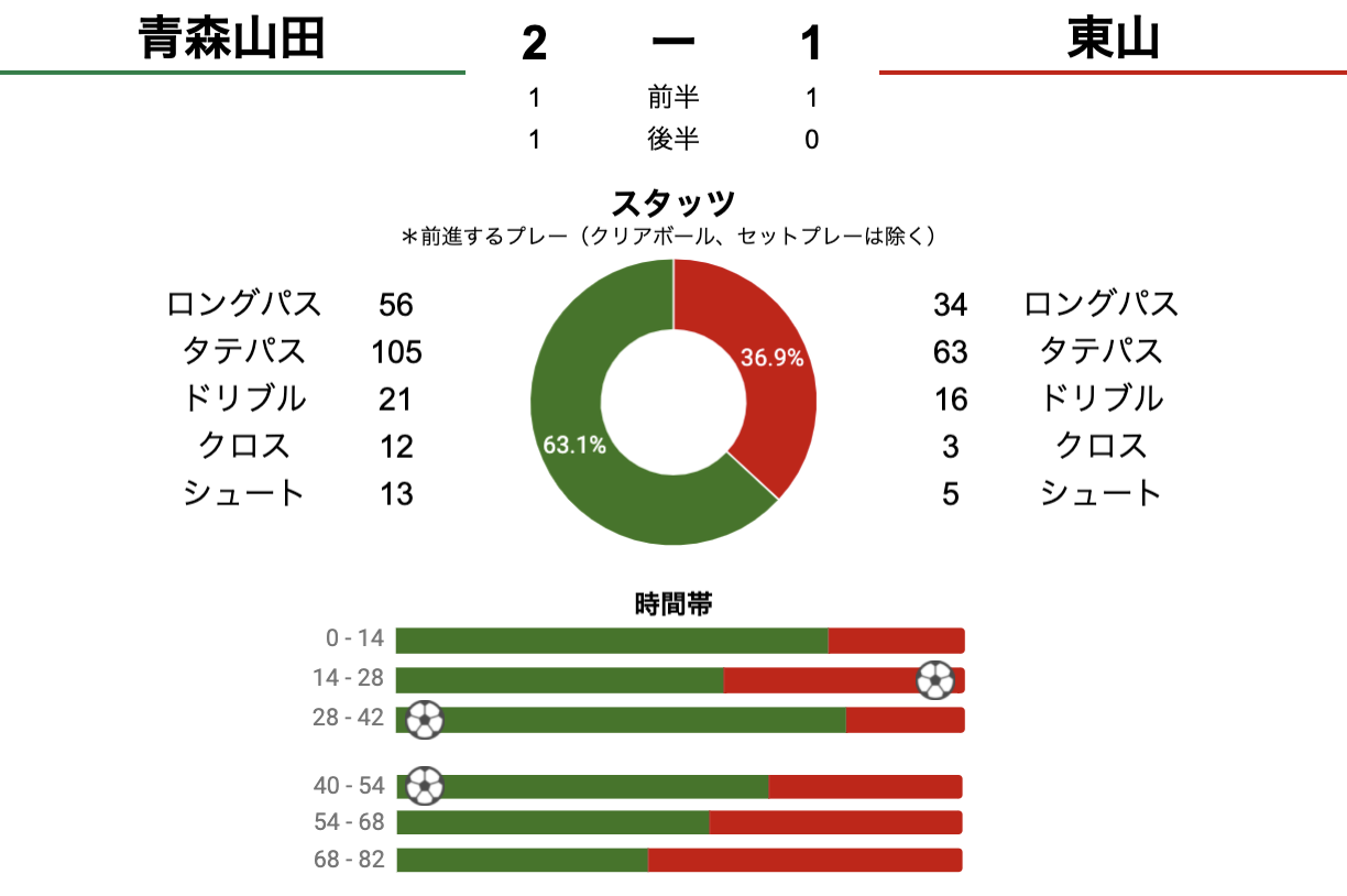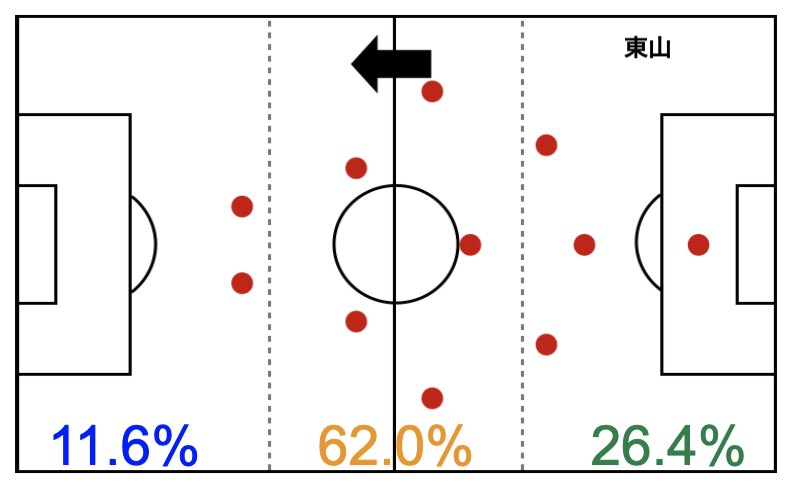 東山は攻撃を受ける回数が多かったものの、フィールド中盤でのプレー割合が高く、うまく青森山田を自陣から遠ざけることができていました。
