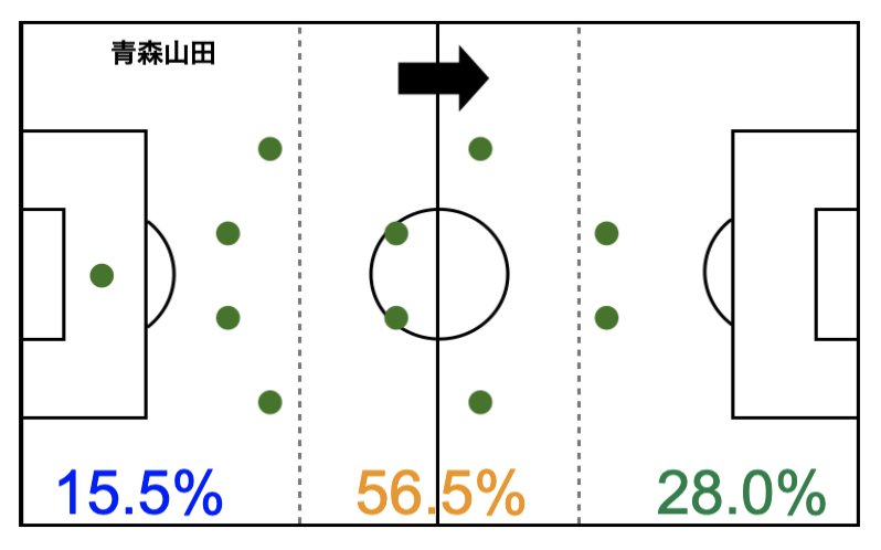 青森山田は攻撃を仕掛ける回数が多く、自陣1/3でのプレー割合は少ないものの、フィールド中盤でのプレー割合が高く、相手陣地へは簡単に侵入しきれない展開が続いていました。