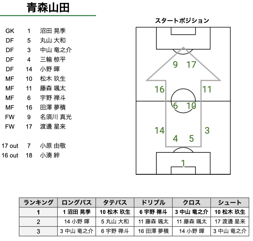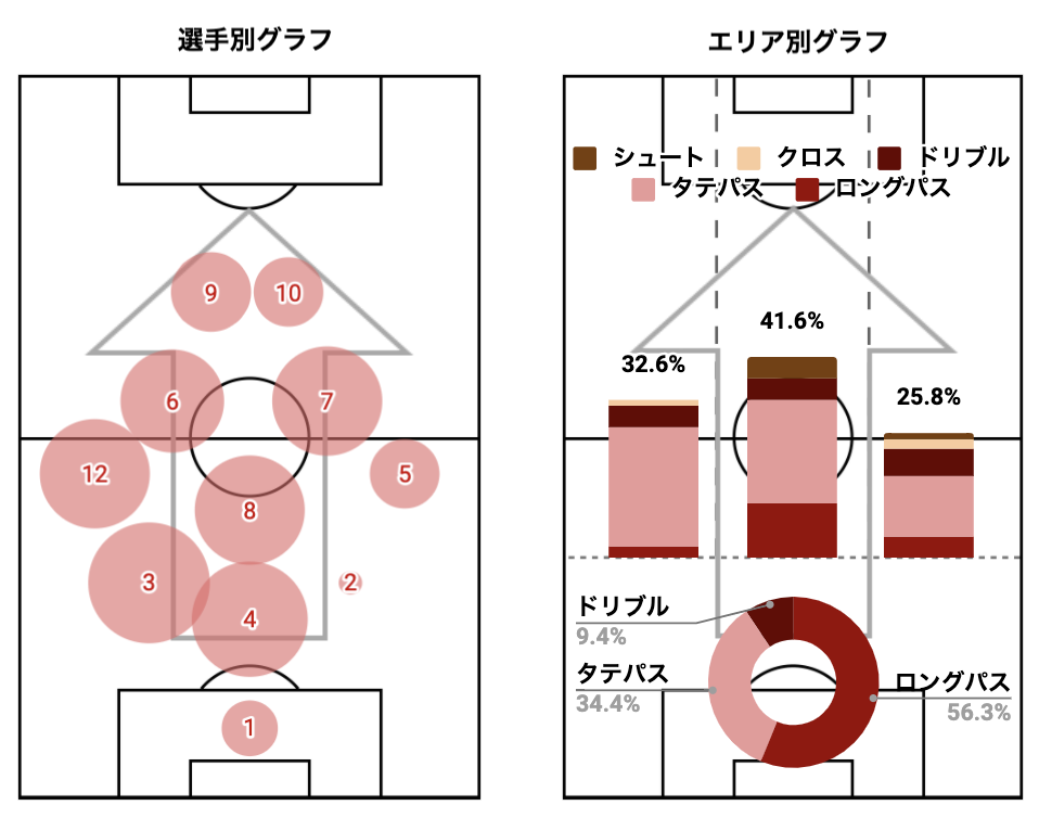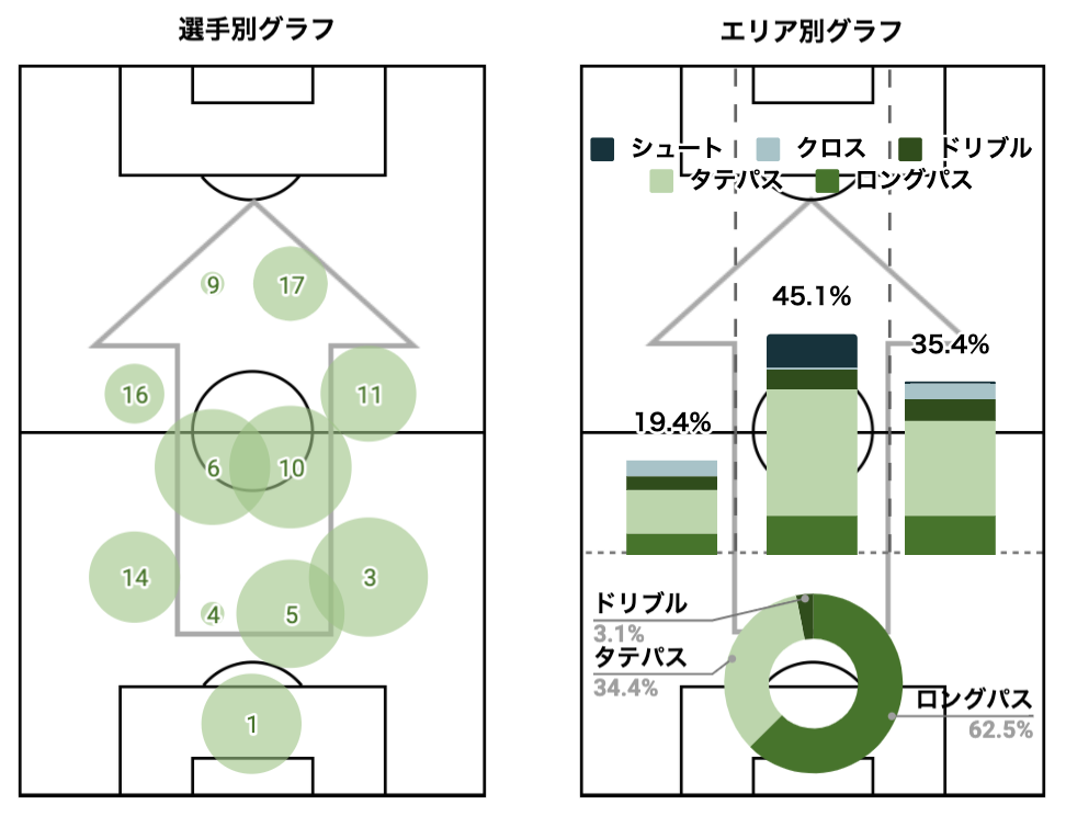 以上は、SPLYZATeamsを使って、前進するプレー(ロングパス、タテパス、ドリブル、クロス、シュート)と、プレーが起きた位置、プレイヤーにタグをつけ、その集計結果を使って作成されたレポートです。(セットプレーやクリアボールなど、味方に通す意図が汲み取れないプレーは集計されていません)