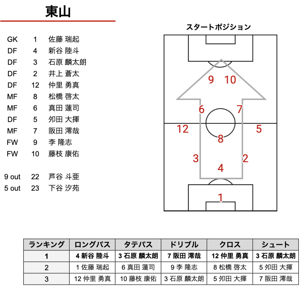 中央の10番(松木選手)、6番(宇野選手)が攻撃の中心にいて、両サイドバックは積極的に高い位置での攻撃参加が多く見られました。特に右サイドは11番の藤森選手、3番の中山選手の連携でクロスを上げる機会を多く作っていました。