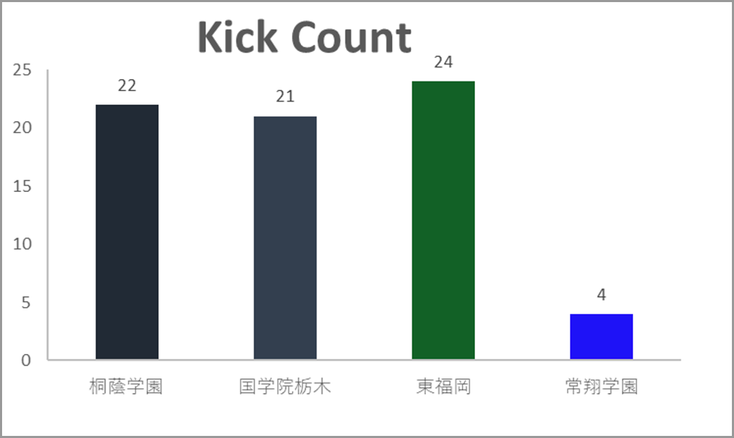 常翔学園は圧倒的キックの少なさが特徴でした。キック数は4本であり、敵陣に入ったハーフウェイからは0本で、レッドゾーンEXITのみにロングキックを使用していました。