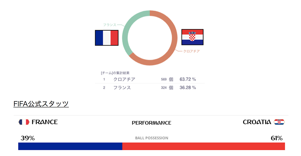試合を通じて、クロアチアがボールポゼッションして攻め込もうとするのに対して、フランスはうまく守りながらカウンターを狙うという構図でした。その構図はパスデータにも表れています。
