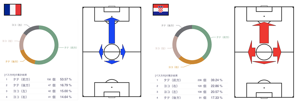 フランスはクロアチアと比較して縦パス比率が高い。フランスは縦に速く前進しており、クロアチアは横パスを使いながら前進していたことが分かります。