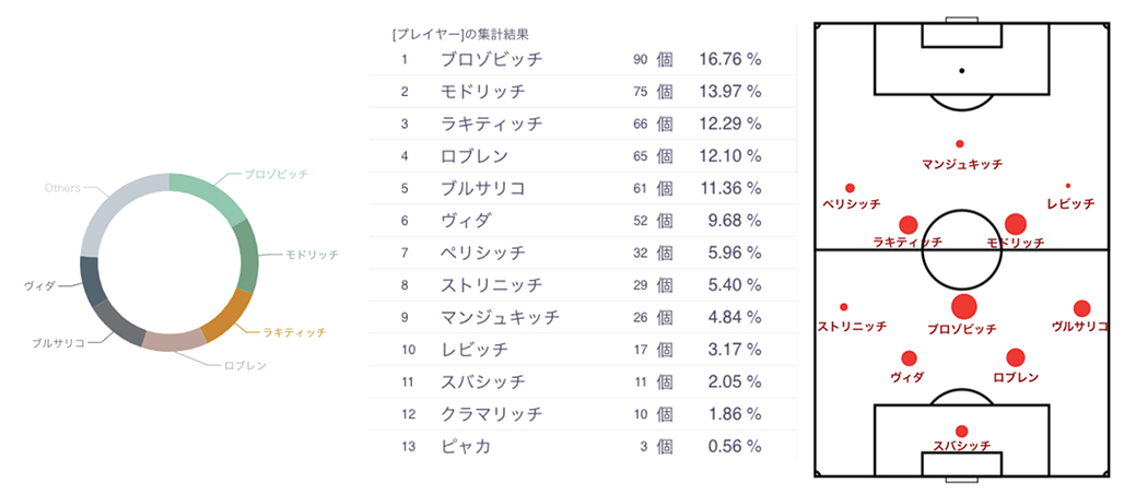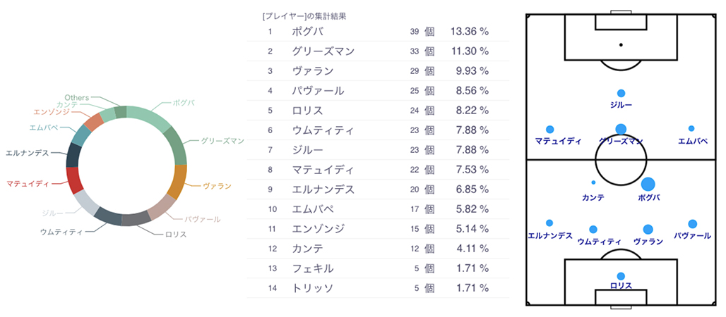 クロアチアがボールを扱いながら攻撃を仕掛けていく中で、フランスがしっかり守って縦に速くカウンターという構図がデータに表れており、その中でキープレイヤーにボールが集まっていることも分かります。試合で生まれたフランスの4得点は、セットプレーx2、カウンターx1、自陣からの仕掛けx1で、狙いのカウンターから1得点していることから、戦術が効果を発揮したと言えそうです。一方で、クロアチアの2得点は、セットプレーx1、相手GK(ロリス)のミスx1と、得点できてはいるものの、チーム戦術が効果を発揮していたかは疑問が残ります。
