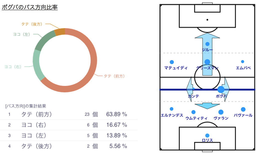 パスに最も関与したポグバの6割が前への縦パスで、3割が左右へ横パスでした。ボールを受けたら左右に振るより、まずは縦に速くボールを運ぶというポグバの意識が表れています。