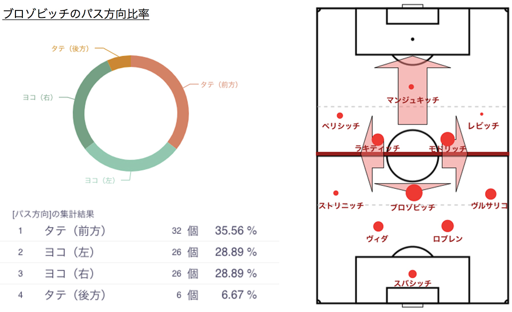 ブロゾビッチがロブレン、ヴィダからパスを受けて左右に振り分けつつも、攻撃は中盤の右に位置するモドリッチを経由する傾向が見受けられます。ヴルサリコのパス本数から、右サイドで攻撃を仕掛けていたことも想像できます。レビッチは3トップの右としてプレーしていましたが、サイドからパスというよりも、中央でパスを受けてシュートを狙っていたとも読み取れます。
