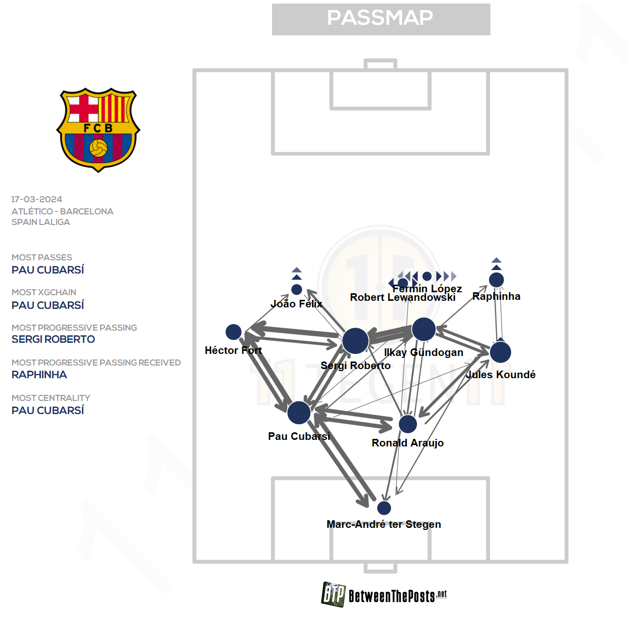 一方、チャビ監督率いるバルセロナは、シーズンを通して課題となっていたプレスへの対応に苦戦します。アトレティコのマンツーマンプレスと連動したカバーリングに試合序盤は翻弄されていたものの徐々にアジャストし、22分にジョアン・フェリックスが起点となり、バルセロナが先制。フェリックスが左サイドから突破し、パスを受けたギュンドアンが折り返し、レヴァンドフスキが得点を決めました。