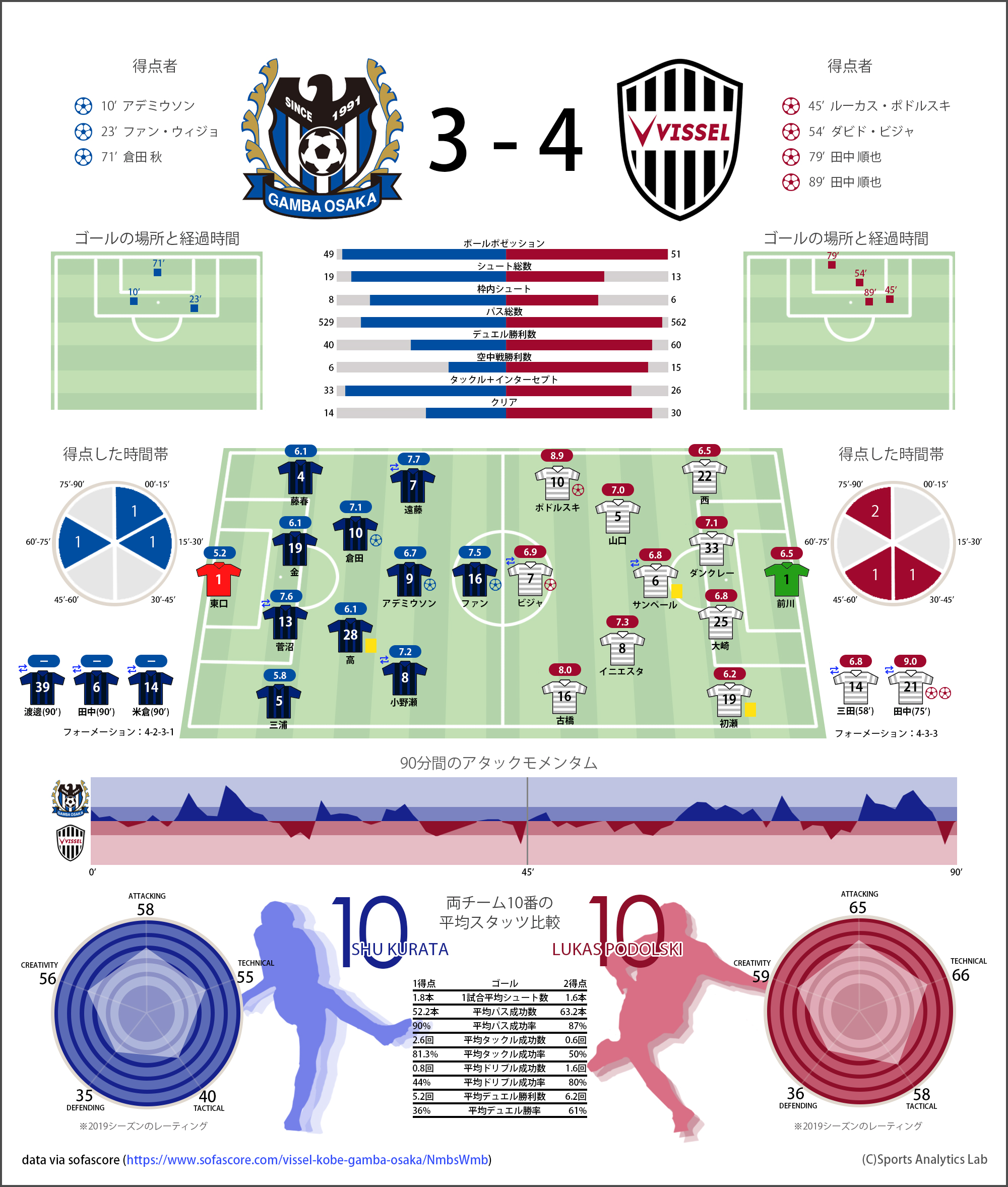 名勝負となったG大阪と神戸の試合をスタッツで振り返ってみようと思います(図内のデータはSofascoreからの引用)。タックルやインターセプトに関してはガンバが上回っていますが、地上戦や空中戦でのデュエルは神戸が勝ち越しています。今回もボール奪取に関しては「1対1でボール奪取が生じた場合」に限定してデータを採取していますので、スタッツと比べても大差ない結果となりました。やはり相手との競り合いでボールを奪ってから攻撃権をモノにするということは、相手も少なからずバランスを崩している状態になるため、自ずと優位な状況を生み出すことにも繋がります。アタックモメンタムを見ても積極的に前進しようとするガンバに対して、ヴィッセルは少しトーンダウンして冷静にパス回しをする時間帯を多く選択し、勝負どころでロングボールやスルーパスで局面を打開していました。そのような時間のコントロールについても、VIP(ビジャ+イニエスタ+ポドルスキ)を要する神戸が僅かながら上手(うわて)であったと感じる試合展開でした。途中出場となった三田選手もしっかり中盤の鎹となり、田中順也選手は出場時間15分で2ゴールと、リージョ監督の的確な選手交代も違いを生み出していました。
