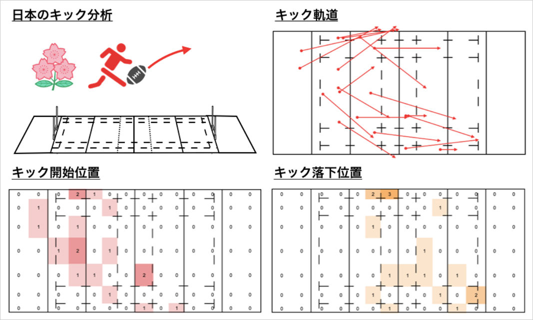 開幕戦の両チームトータルのキック数70回に対して、2戦目は37回と、初戦に比べて少ないキック数の試合でした。日本のキックは18回で全体としては右側へのキックの方が多かったです。