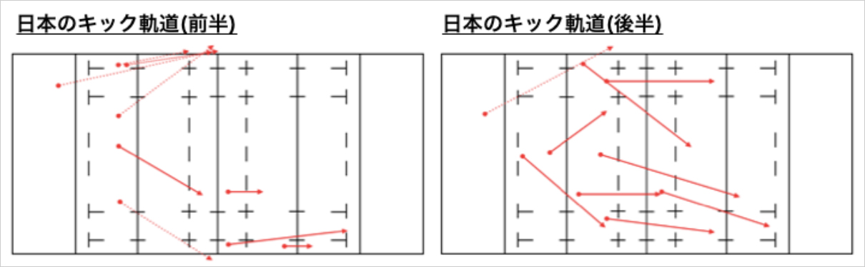 特に前半は右側のみで、チームとして右ウィングを狙っていたと捉えられます。後半はその傾向は見られず、日本陣地に攻め込む機会が減ったことや、日本に対応され出したことが影響していると考えられます。