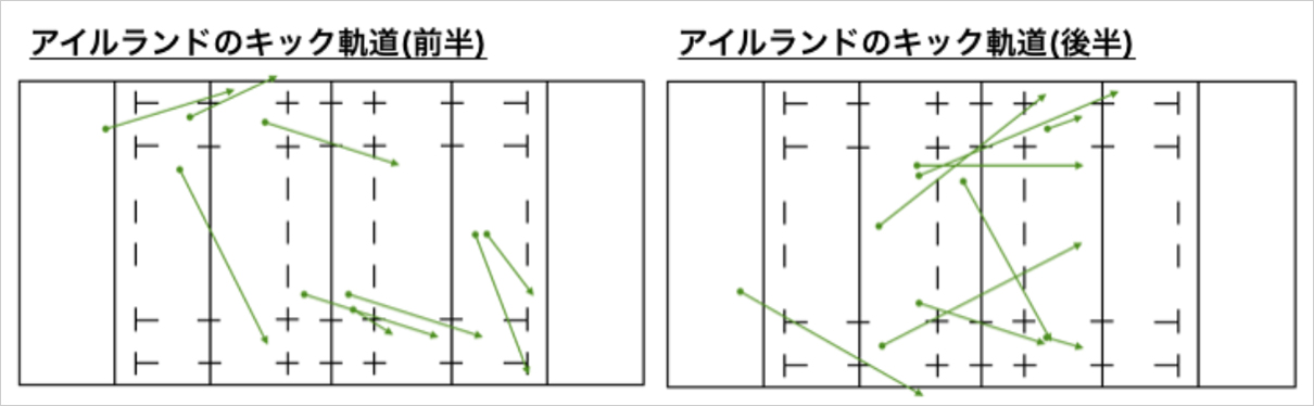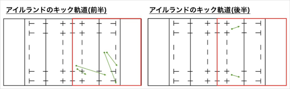 アイルランドの前半は相手ゴールライン付近では右側へキックする傾向でした。後半は左側へのキックが増えました。