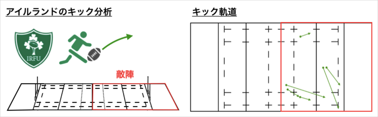 アイルランドのキックですが、試合を通して右側を狙っていたことが、敵陣でのキック軌道から見られます。