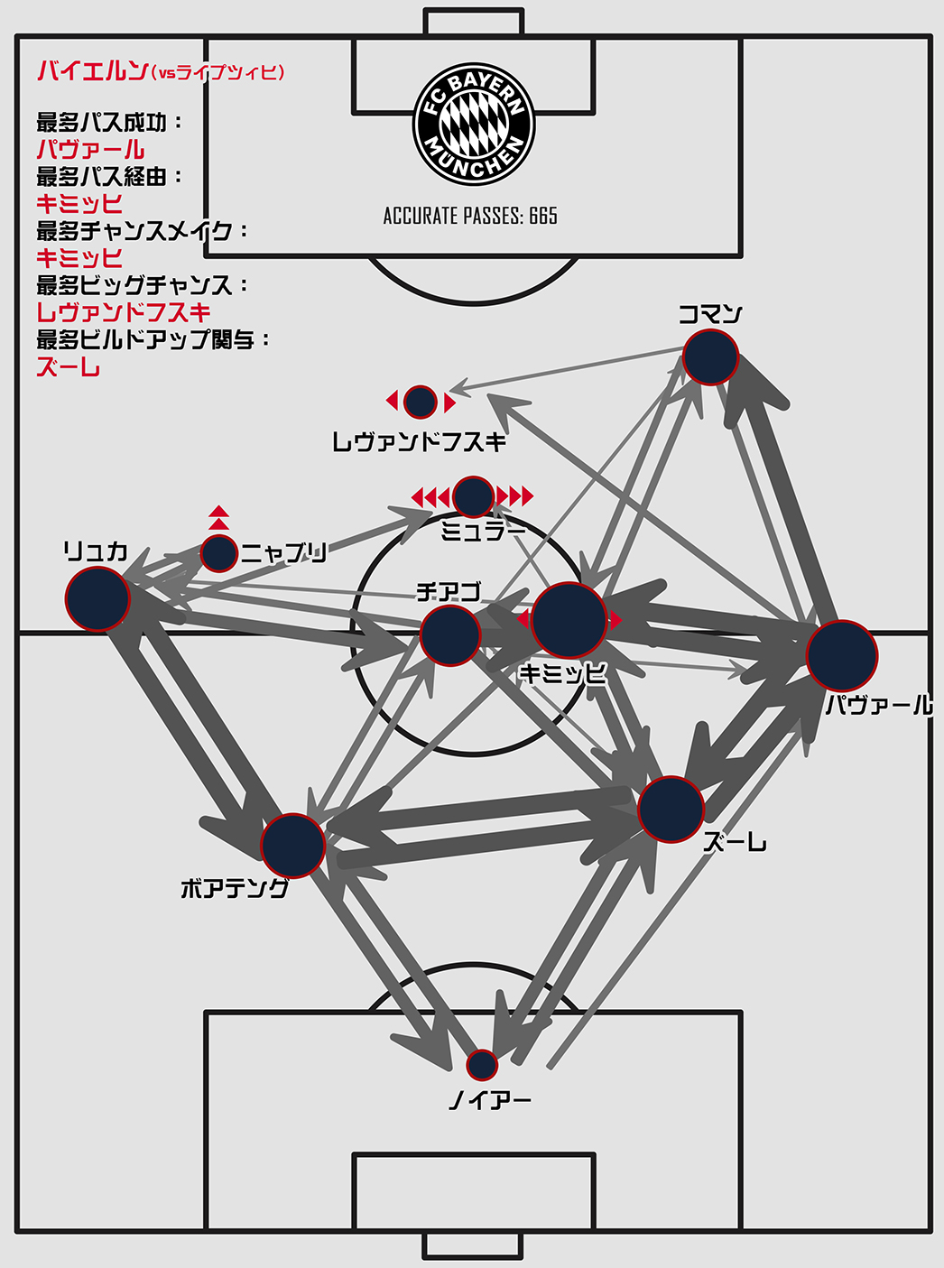 まずはバイエルンのパスマップから振り返ります。この試合は特に前半、圧倒的なバイエルンの支配でゲームが進みました。立ち上がり早々にバイエルンが先制したのもあり、落ち着いてバイエルンが試合を組み立てる形からスタートします。ライプツィヒの積極的なプレスを受けて最終ラインこそそこまで高い位置は取れていませんでしたが、DFとMFでのパス回しで相手を揺さぶりながらトップの位置にいるレバンドフスキに縦パスを入れたり、(右ウイングにいる)縦への推進力を誇るコマンへ、裏を抜けるスルーパスを供給するようにしていました。