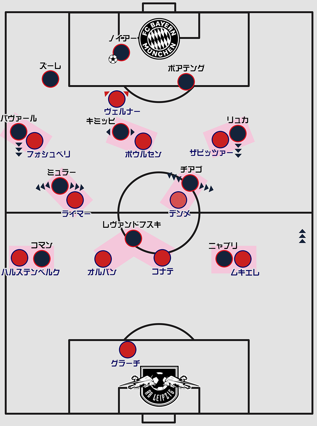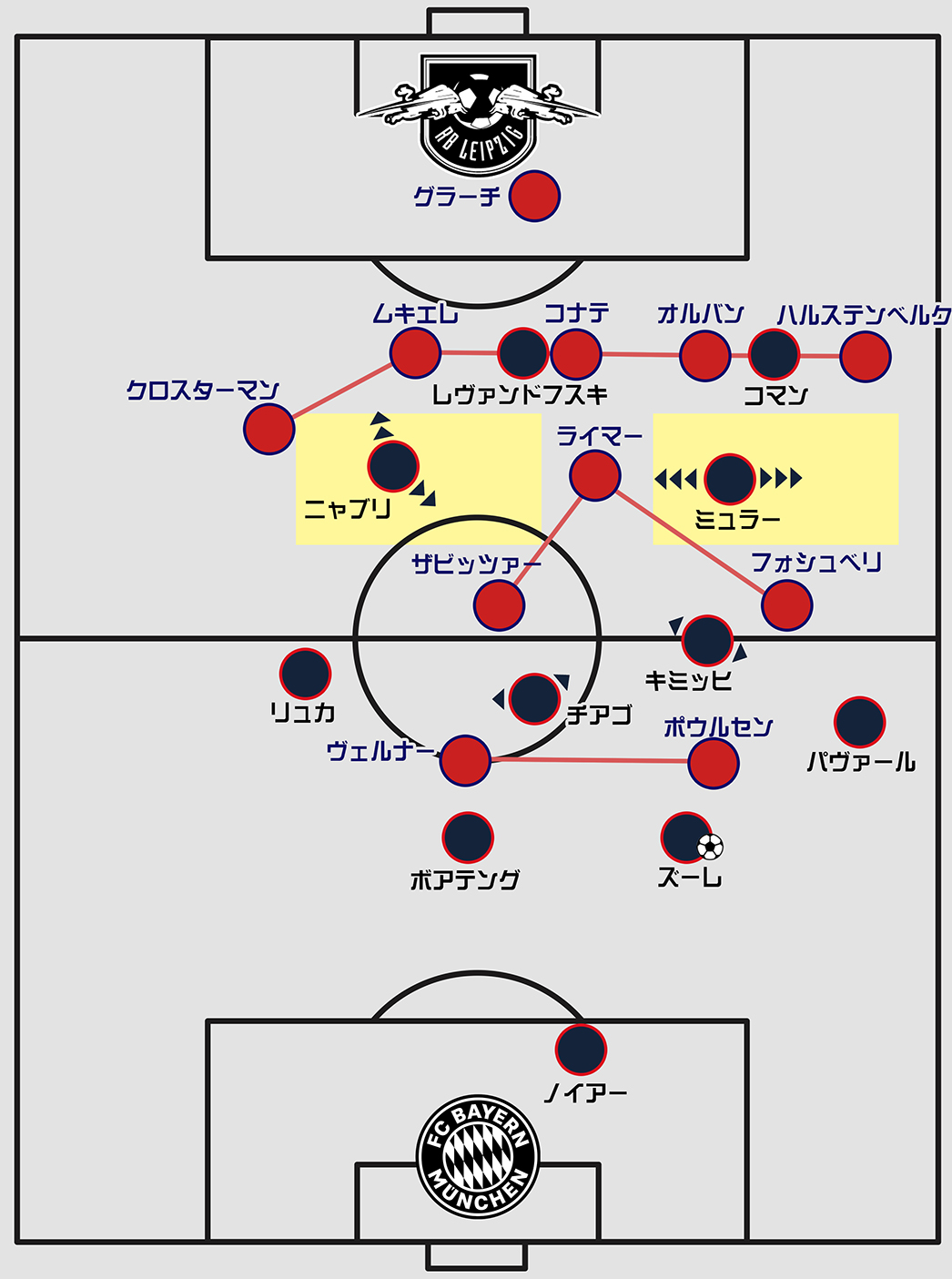 元ホッフェンハイムでナーゲルスマン門下生であった左ウイングのニャブリはまだコバチ監督の信頼を完全には勝ち得ていないようでしたが、役割としてミュラーと同じ高さまで下りてきてボールを受けるシーンが何度か見受けられました。同じウイングでも左右非対称の役割が与えられていたようです。そしてパスの一番の出し手&受け手となったのはキミッヒ。彼は多くのチャンスも演出していました。またズーレ+パヴァール+キミッヒのショートパスワークの精度の高さが、この試合のバイエルンのビルドアップの生命線になっており、ライプツィヒもそこを狙って執拗にプレスし、ボール奪取の機会を伺うような展開となりました。