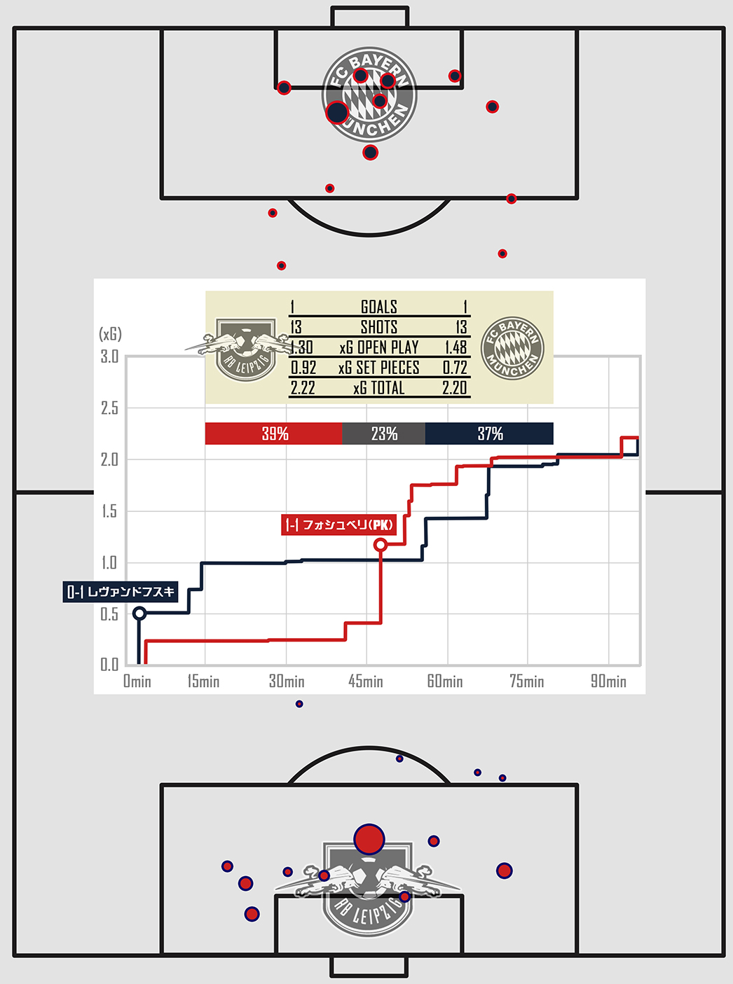 90分間のアタックモメンタムや戦況をみる限りはバイエルンの圧倒的優位で試合が進みましたが、得点期待値を指し示す「xG」上では僅かながらライプツィヒが上回る結果となりました。シュート数は同数でしたが、ライプツィヒは最も期待値の高いPKを決めたことも影響しています。