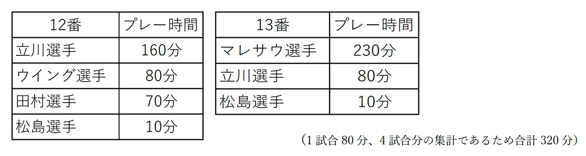 2019年では、全試合12番中村選手、13番ラファエレ選手がスタートメンバーとして出場しました。2選手とも驚異の300分超え、ラファエレ選手は全試合フル出場であり、2019年大会において絶大な信頼を得ていたと言えます。まさに「替えの効かない選手」でした。