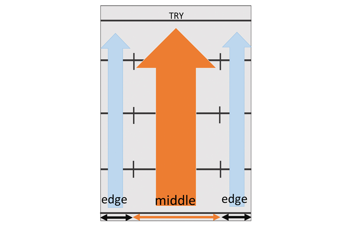 また、グラウンドの両タッチライン~15mまでをedge、15m~15mの間をmiddleと分類しています。
