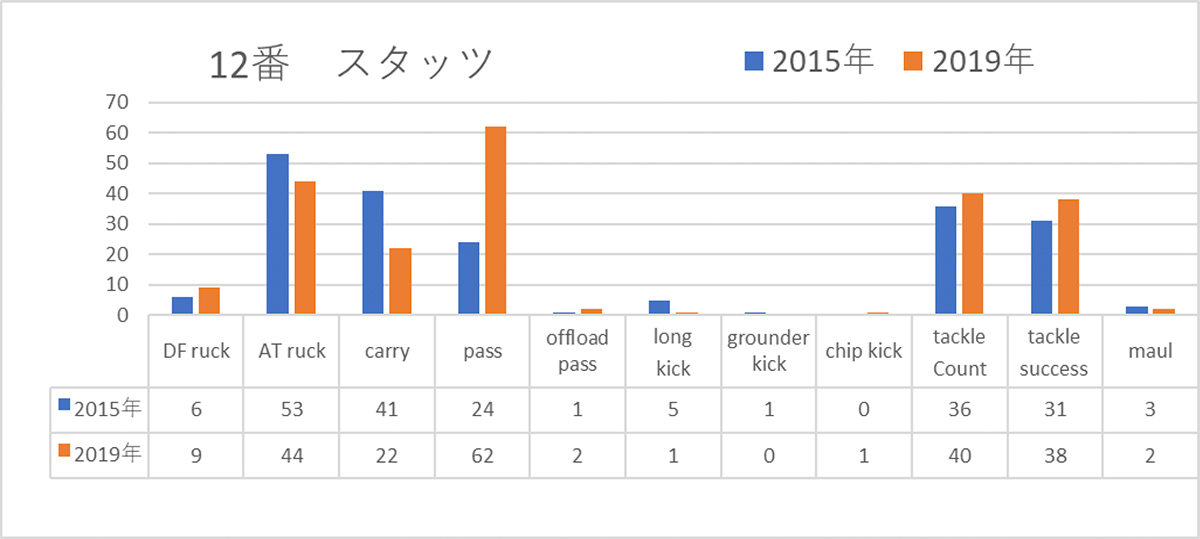 その他のスタッツをみると、2019年では、タックル数が2015年を勝る回数であったことや、FWのポットに入ってたことから、中村選手のフィジカル的献身性の高さがうかがえました。