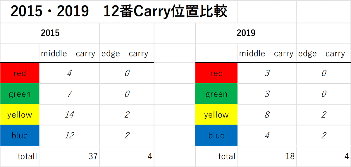 次にcarryについてですが、2015年は24回、2019年25回と同数のように見られますが、下記のデータを見るとその「質」の違いが見えてきました。