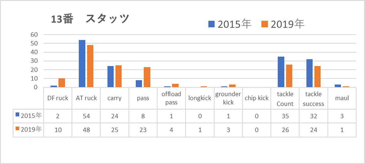 まず、2015年大会ではセンターでプレーした選手が5人であり、12番で最もプレー時間が長かったのは立川理道選手、13番はマレサウ選手でした。