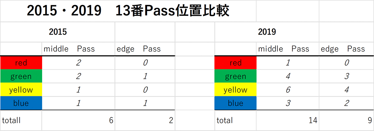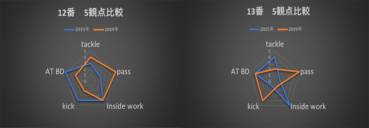 完全に独自観点ですが、2015年2019年におけるセンターのタイプが分かるのではないでしょうか。2015年の12番は、積極的なBDへの参加がみられ、middleでのプレー選択が多くとられました。2019年では2015年同様、middleでのプレーは多く見られましたが、BD参加は減り、Pass、タックルの回数が増加しました。13番では、12番と比較しても、よりプレースタイルの変化が激しかったと言えるでしょう。