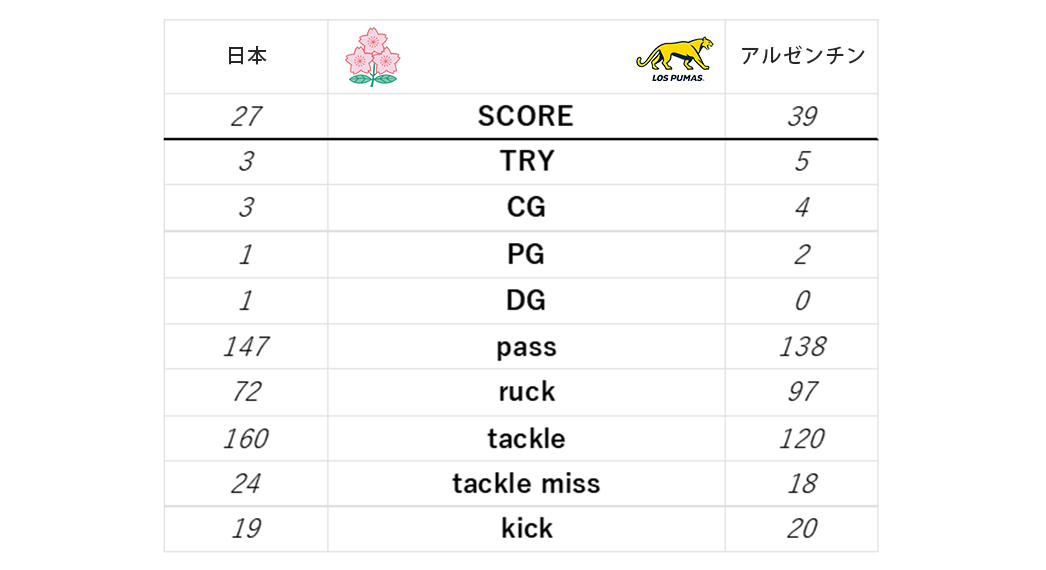 日本は、試合開始早々にラインブレイクからトライを許しますが、その後は中盤でのハイパントとDF中心のラグビーを展開し、アマト・ファカタバ選手の素晴らしいトライなどで15-14で折り返しました。後半、日本はキック主体でありながら、4試合でもっとも多いラック数を重ねるなど、ポゼッションアタックが見られましたが、アルゼンチンのキッキングアタックや、世界屈指のBK陣に走られる場面が増え、27-39で敗戦しました。