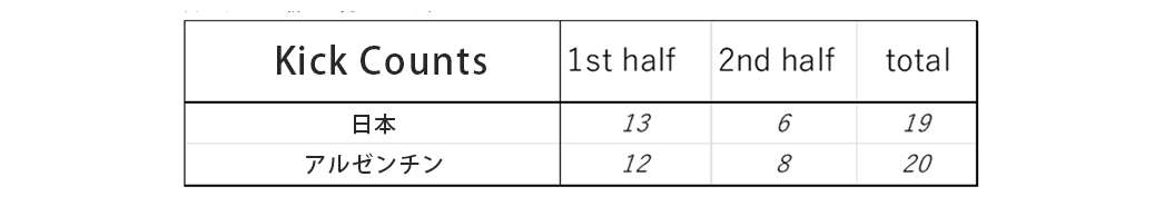 両チームとも同じ程度のキック数となりました。日本だけに限ると、4試合で最小のキック数で、ボールを保持する傾向が見受けられました。