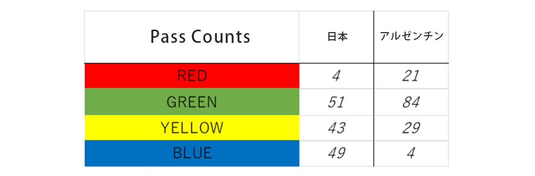 パスの数については、日本147回、サモア138回でした。そのエリアごとに見てみると、日本はREDゾーンでは4回でした。徹底して、速くEXITする傾向が見られました。両チームとも、敵陣(サモアはGREEN,REDゾーン、日本はYELLOW,BLUEゾーン)でのパス比率は70%を超えており、自陣から積極的なボールを動かすのではなく、敵陣での展開が多く見られたことが分かります。
