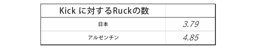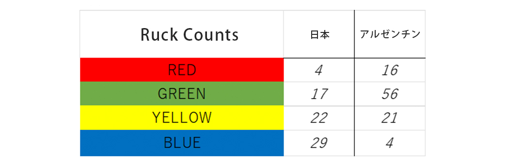 上記の表は、キック1回に対するラックの数を表しています。やはり、日本は4試合の中で最も大きい値となりました。依然としてキック主体である印象に変わりはありませんが、この試合ではラック数を重ね、キックへのオプションに繋げていたことが分かりました。また、BLUEゾーンでのラック数が増えたこともキック数減少に繋がり、エリア、ポゼッションとも同等の両チームにとって似通った数値となりました。
