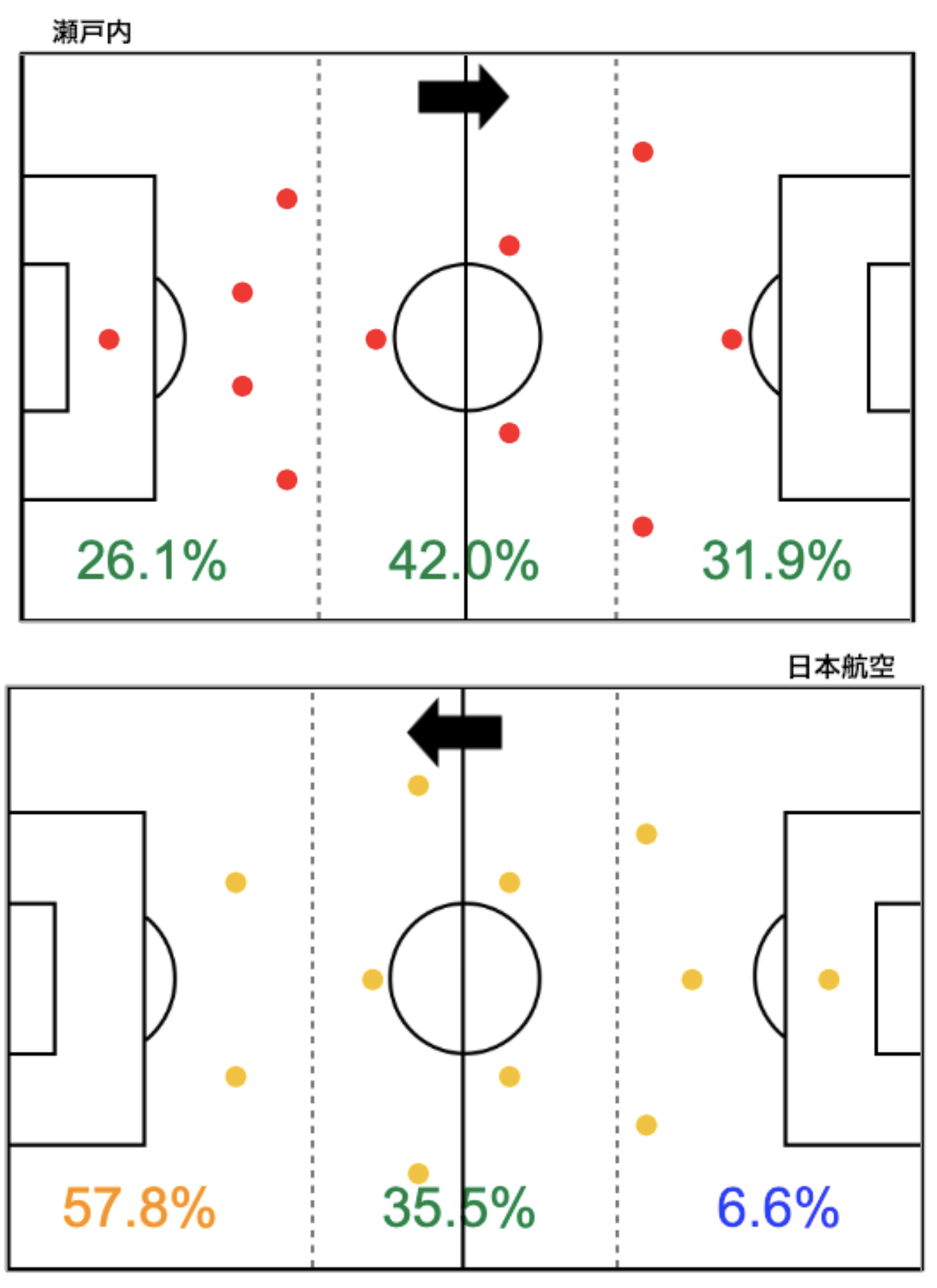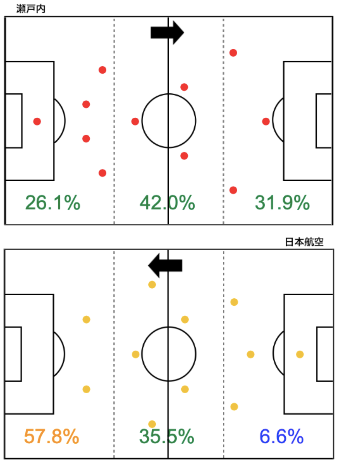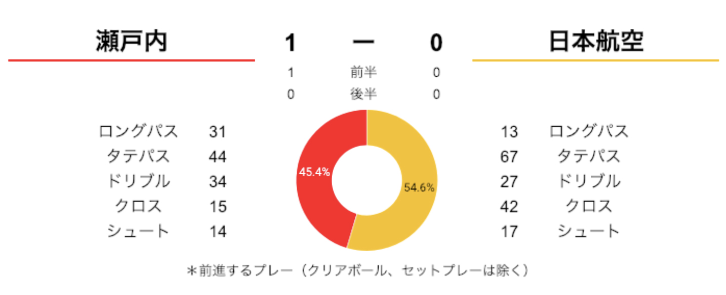 瀬戸内は4-3-3、日本航空は3-5-2でスタート。日本航空のプレーの57.8%は瀬戸内の陣地という数字から、日本航空は、かなり前からプレスして、攻め込んでプレーしていたことがわかります。そんな中でも瀬戸内は、相手陣地にボールを運んでシュートまで持ってくこともできていました。