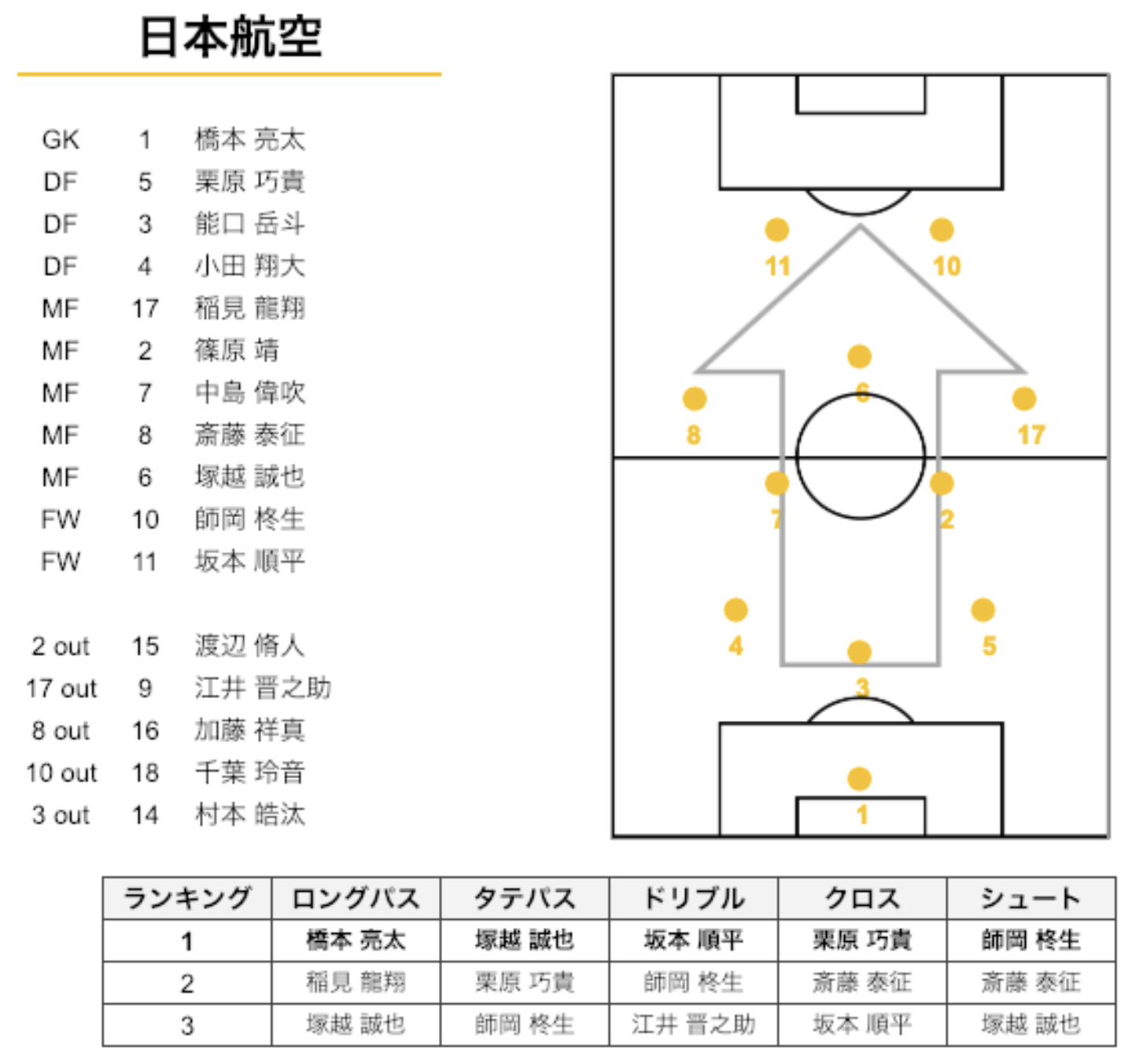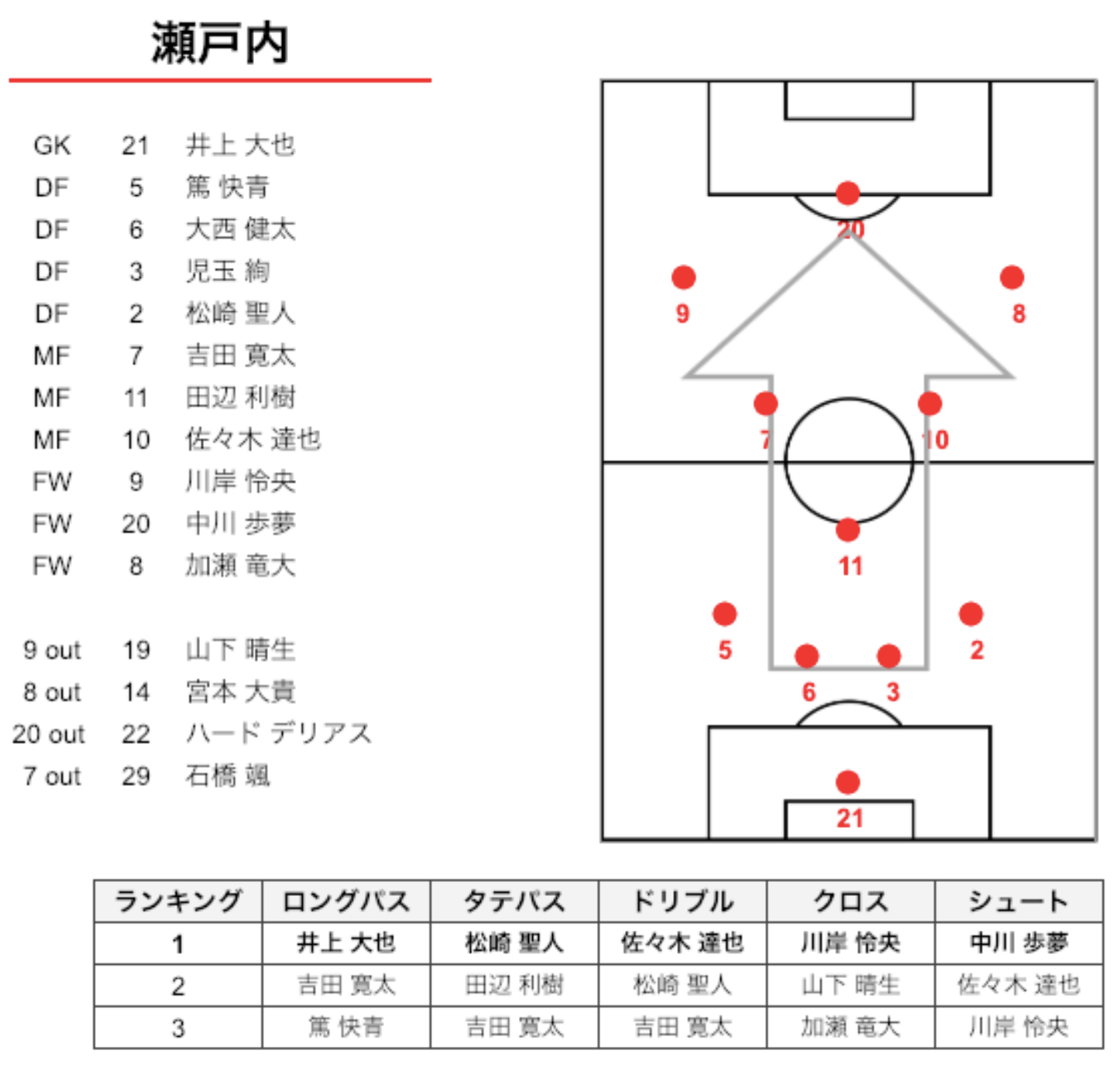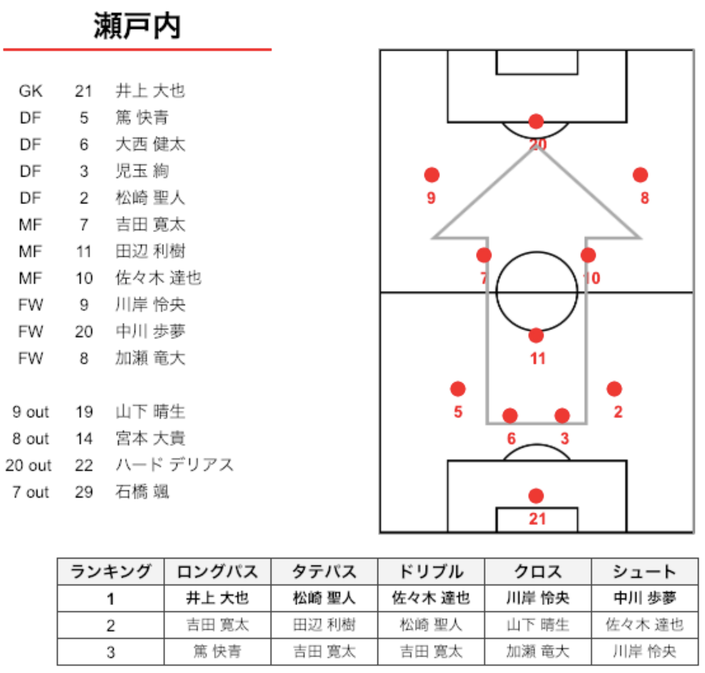 瀬戸内は4-3-3、日本航空は3-5-2でスタート。日本航空のプレーの57.8%は瀬戸内の陣地という数字から、日本航空は、かなり前からプレスして、攻め込んでプレーしていたことがわかります。そんな中でも瀬戸内は、相手陣地にボールを運んでシュートまで持ってくこともできていました。