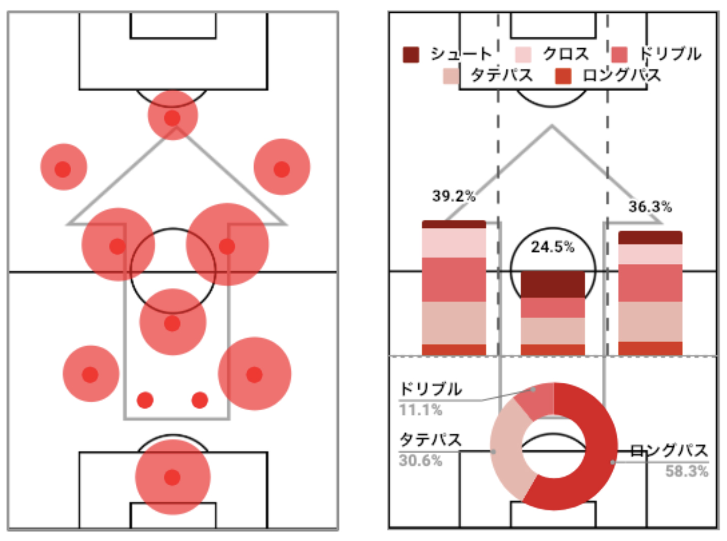 以上は、SPLYZATeamsを使って、前進するプレー(ロングパス、タテパス、ドリブル、クロス、シュート)と、プレーが起きた位置、プレイヤーにタグをつけ、その集計結果を使って作成されたレポートです。(セットプレーと、クリアボールなど、味方に通す意図が汲み取れないプレーは集計されていません)