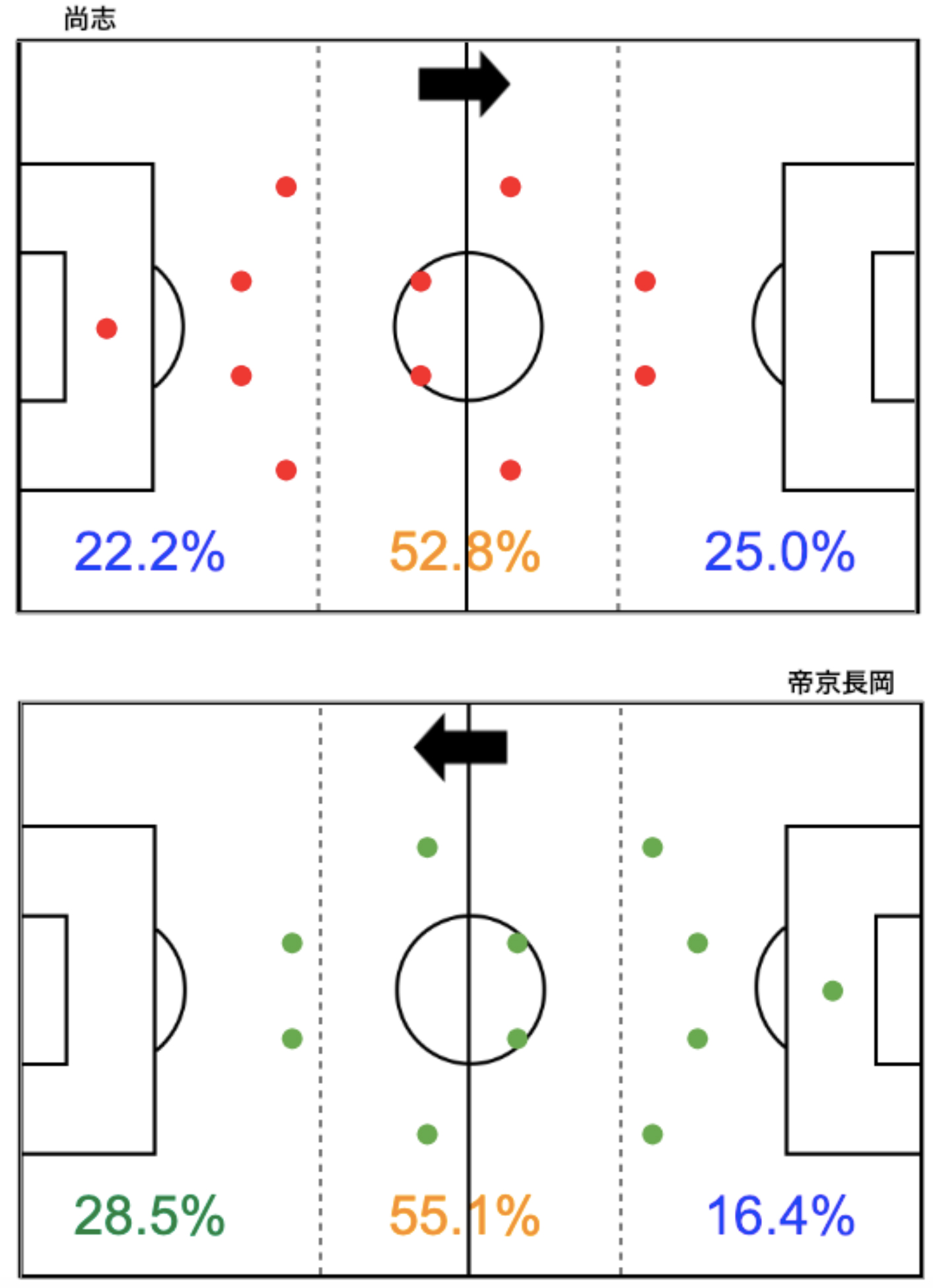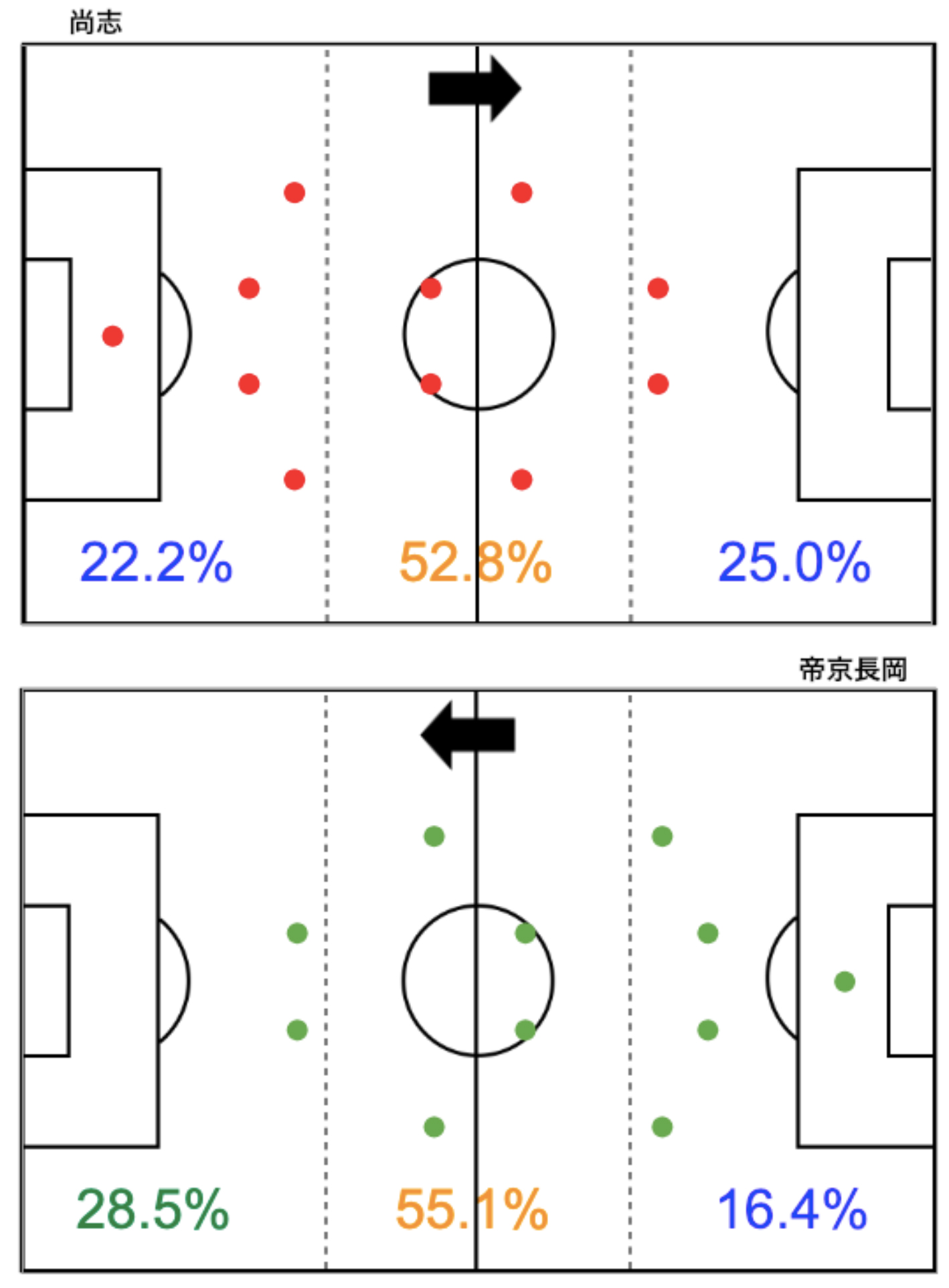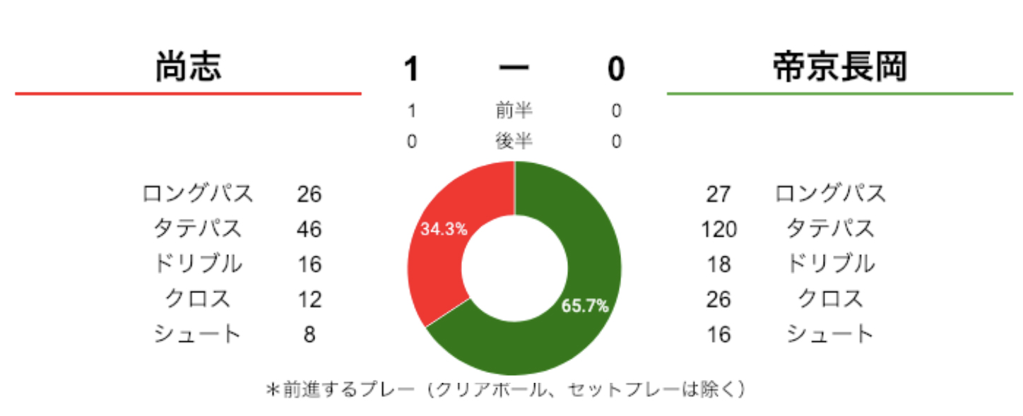 共に4-4-2でスタート。全体としては中盤でのプレーが多い試合でした。特に帝京長岡が中盤からしっかりと組み立てていたのが、数字に表れています。