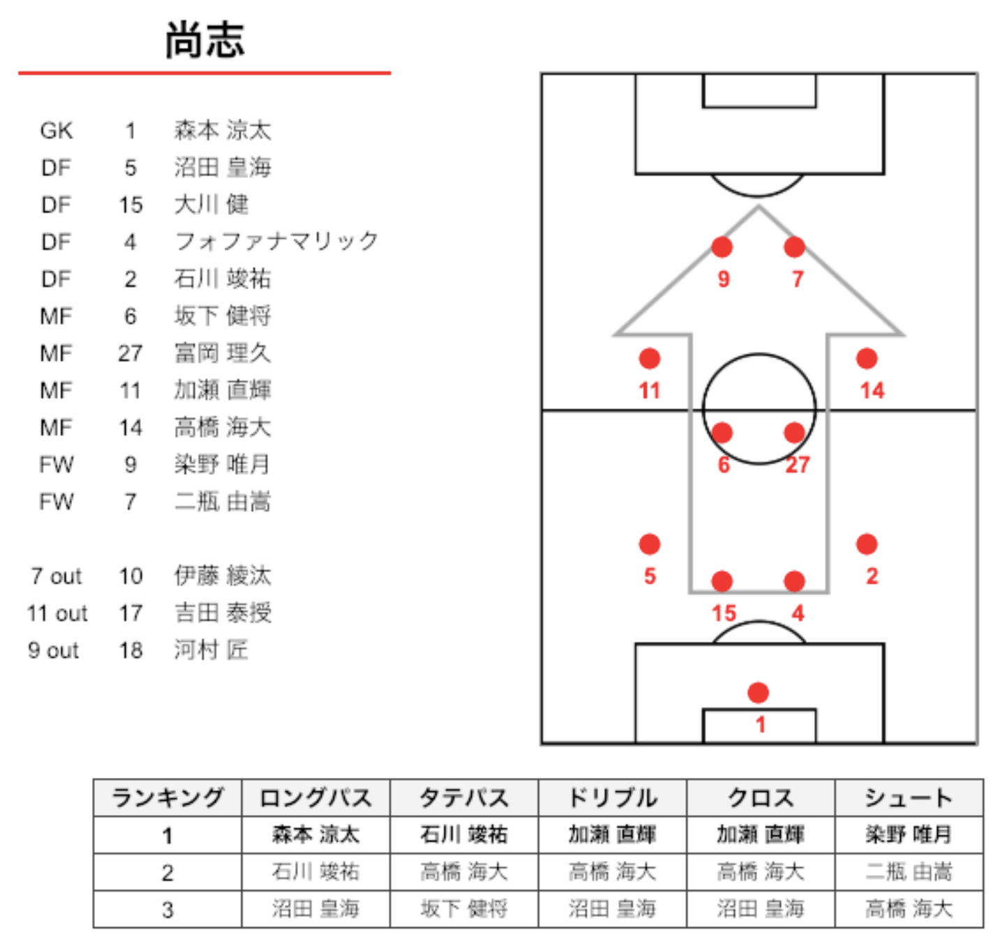 ドリブル、クロスは11番の加瀬選手が最も多く、2番目に14番の高橋選手。攻撃のキーマンは両サイドの選手。
