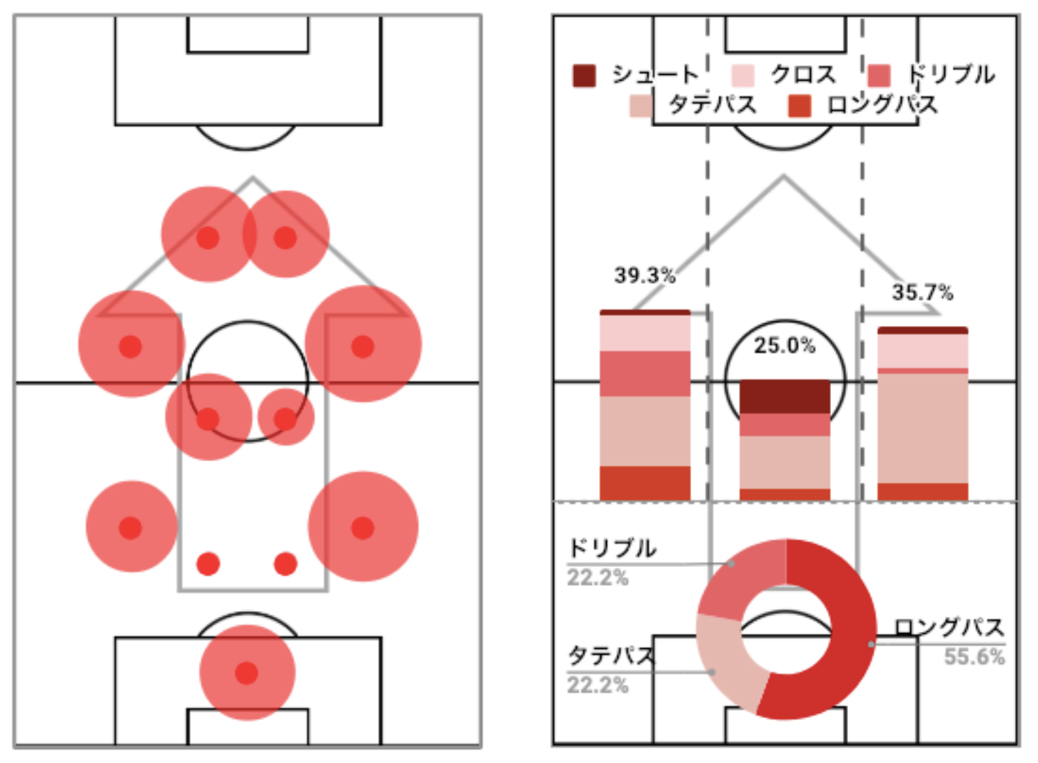 右の図の円グラフは自陣でのプレー比率を表しており、この試合では55.3%ロングパスでした。棒グラフは攻撃位置の比率を表しており、中央と比較して、左右の攻撃が多いことが分かります。