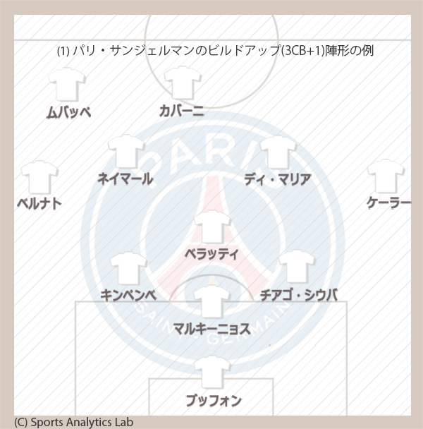 パリのビルドアップのメインコンセプトは、最終ラインから高いキープ力と展開力を誇る司令塔のベラッティにボールを渡すこと。そのために相手の強力なファースト・プレッシング・ユニット(マネ・フィルミーノ・サラー)の波を掻い潜る必要があった。PSGはそれを実行するため、従来のセンターバックであるチアゴ・シウバとキンペンベが開きHV(3CBの左右)となり、中央にマルキーニョスを吸収する形でベラッティと「3CB+1」のダイヤモンドを形成。ベラッティはフリーマンとなり、ボールを受けると華麗に反転し即座に敵陣地にボールを運ぶことが可能となった。この「マルキーニョス・ロール」は前半だけで10回以上も実行されており、最終ラインからビルドアップを行う際には必ずマルキーニョスが3CBの中央に位置取りしていた。マルキーニョスは時折、前線での連動したプレッシングにも参加するなど至る所でボールに関与している。