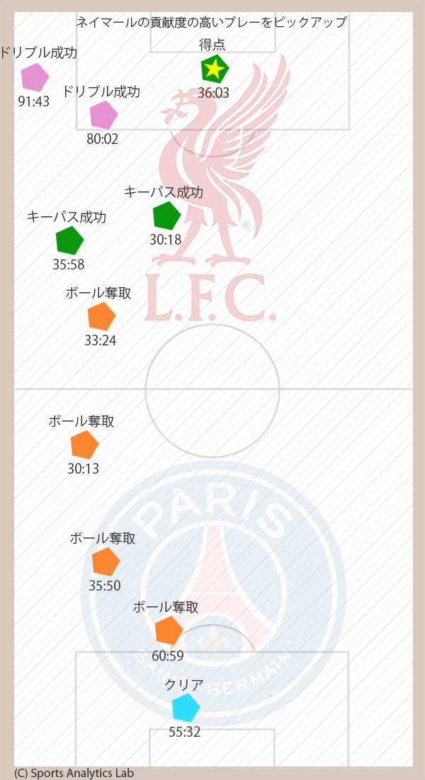 このリベロのような動きをする「マルキーニョス・ロール」によってプレッシングの基準点が曖昧になったことでリバプールの3TOPのプレッシャーを無効化するうえ、特にパリの左サイド、ウイングに張り出したオフェンス力の高いベルナトやネイマールを見るために相手の中盤やサイドバックは徐々に距離間がうまく保てず、特にアンカーの位置にいるヘンダーソンの両脇にはギャップが生じていた。そこにすかさずディ・マリアやネイマールがボールを受けに移動しビルドアップをサポート、ムバッペやカバーニも片側のサイドに寄ることで極めて近い位置でのパスワークで瞬きする暇もないほどの高速カウンターが実行され続けた。特にネイマールはこの試合での貢献度は高く、オフェンス面でのキーパスに加え、要所要所でボール奪取を成功させるなど守備面での活躍も光っていた。彼が自陣でボールを回収すると素早く単騎特攻とコンビネーションを駆使し敵陣地へ侵入、トゥヘルの掲げるコンセプトを忠実に実行し、何度もファイナルサードへと進出していった。