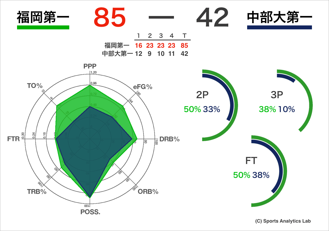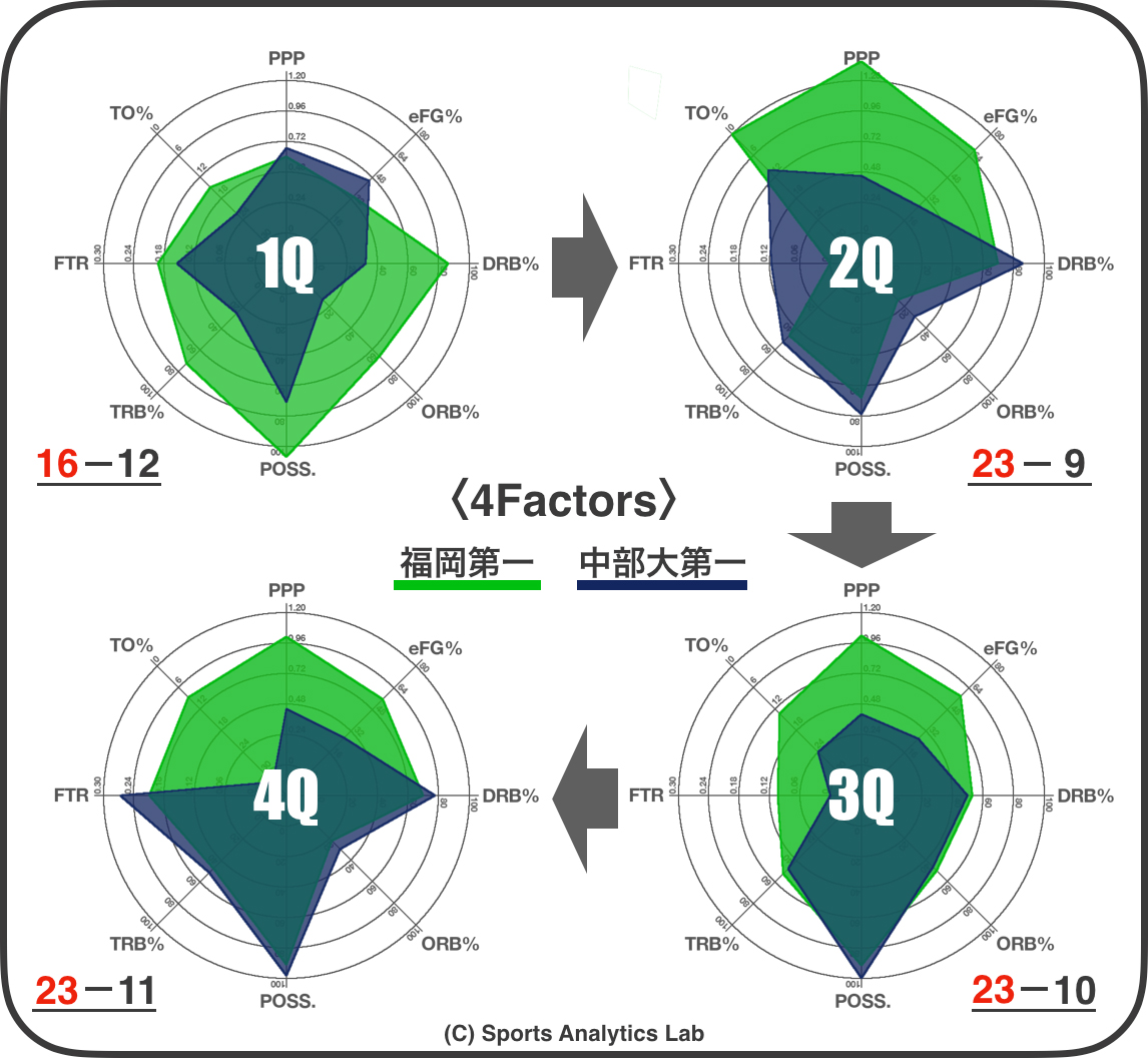 レーダーチャートで気になったのがTO%とeFG%です。eFG%は20%以上の差があります。この2つの大差が、得点効率を表すPPPでWスコアをつけている要因でしょう。また中部大第一はLiveTOも多く、福岡第一はFastBreakPTSも高いことから、ディフェンスから得意の速攻に繋げ、簡単に得点を重ねたのではないか、と考えられます。